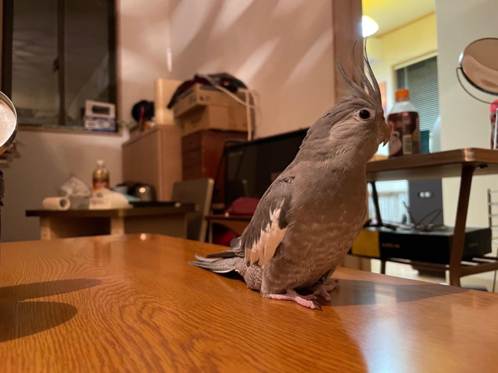 ホワイトフェイスノーマル頬にチークパッチがないタイプで、左脚に青い足輪と、左脚真ん中の爪が欠損してありません。