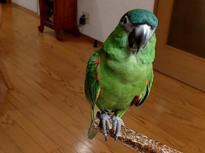 上クチバシの上側半分が白色のコミドリコンゴウインコのハク ちゃん迷子です