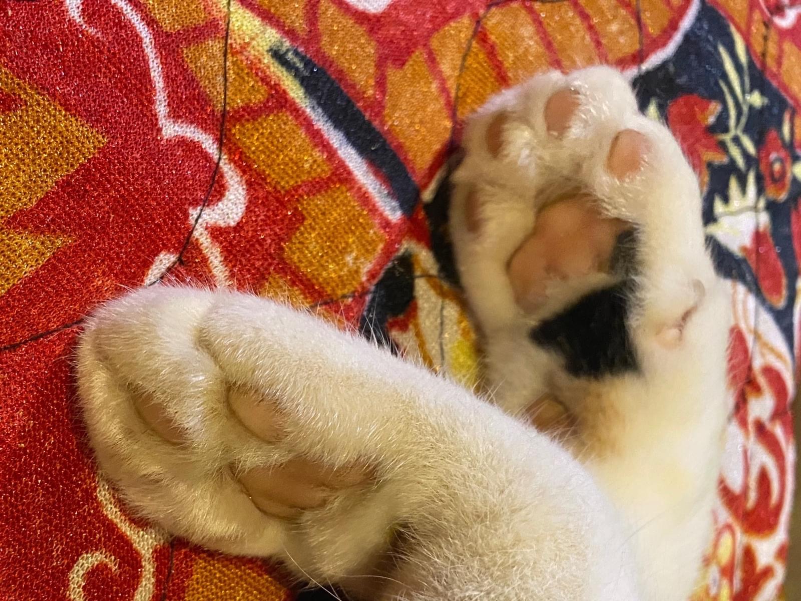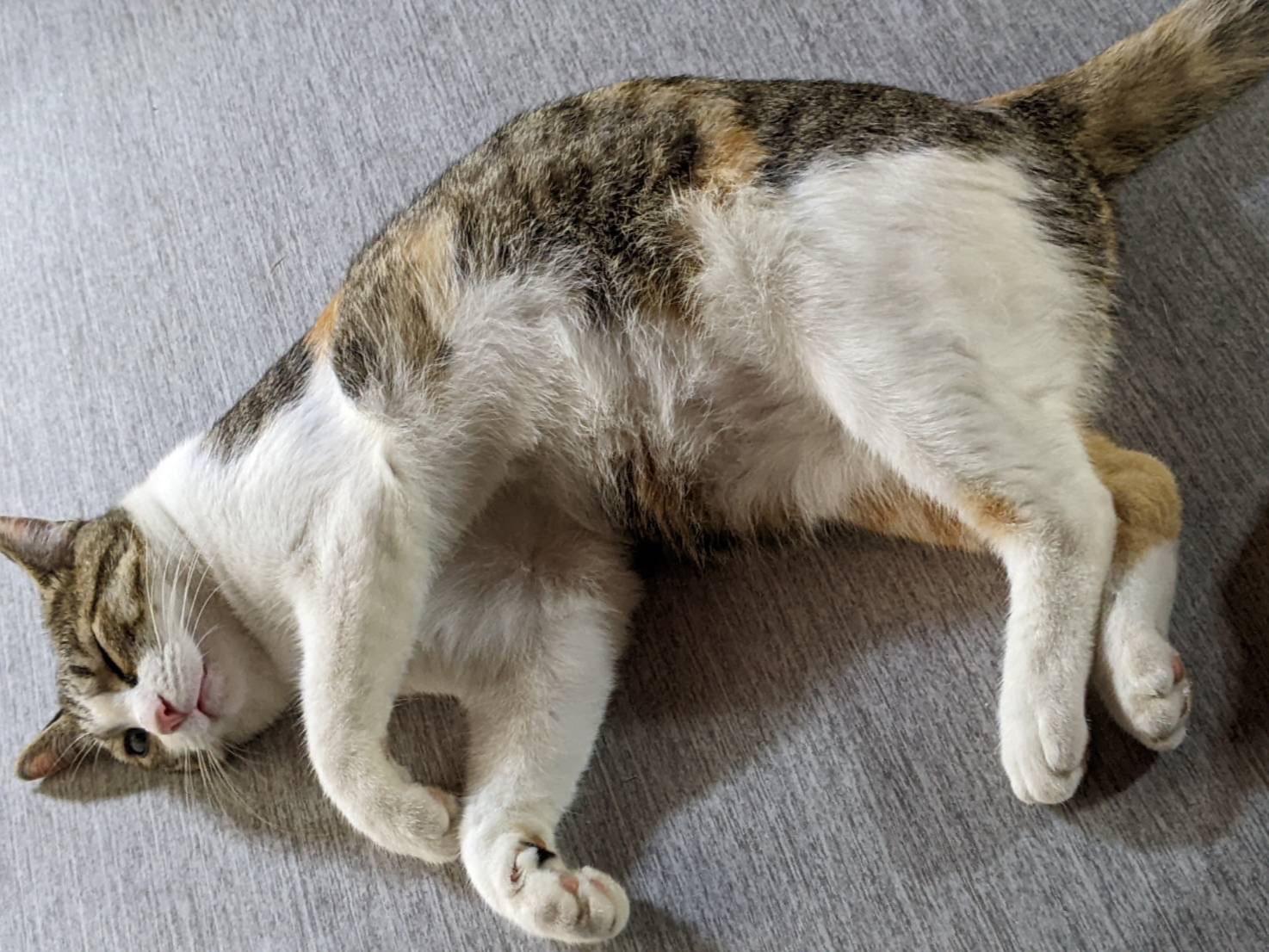 約5キロほどの大きめメスの三毛猫です。アイラインが長めです。鳴き声は高いです。鼻は薄ピンク、首輪はしていません。マイクロチップ入っています。