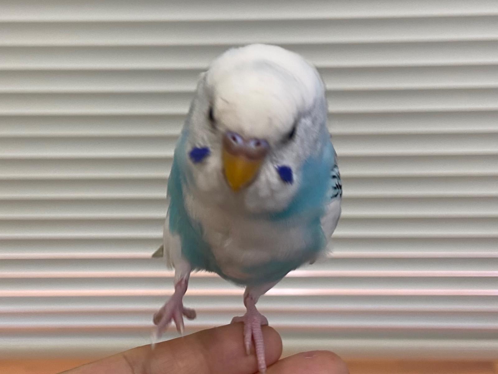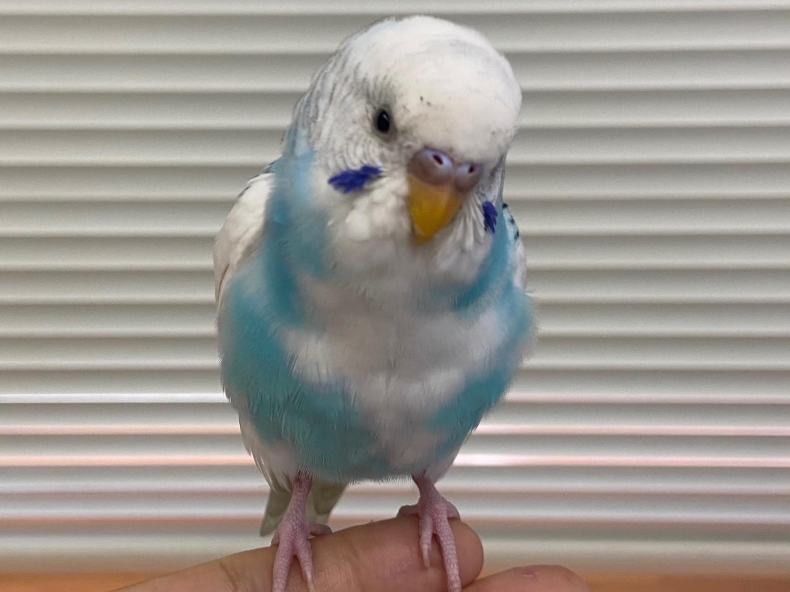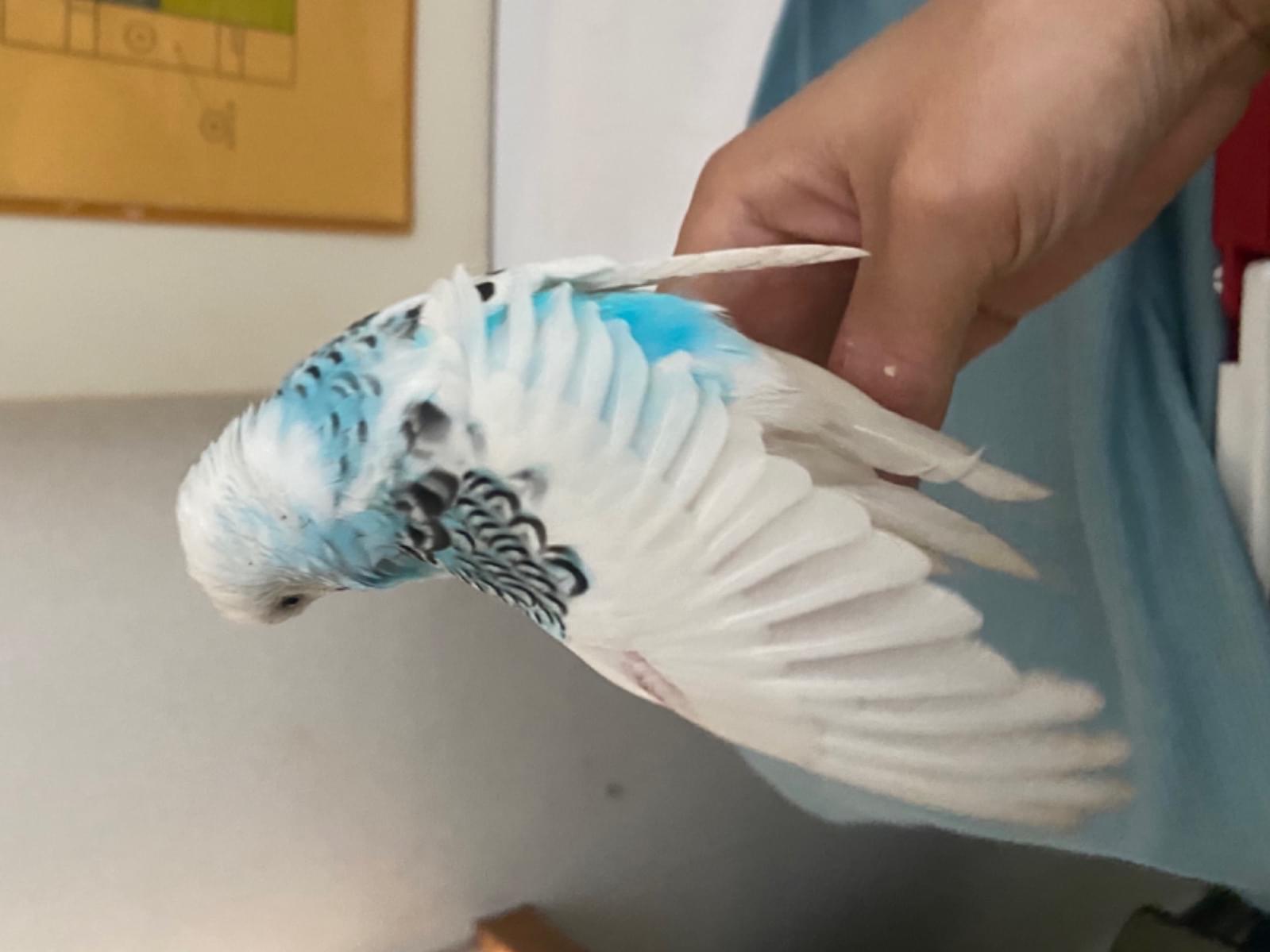 頭は白く、後頭部から顔にかけて少しグレーがかってます。胴体は胸が白く周りや背中が水色です。翼は白に黒い半円状の模様が入ってます。