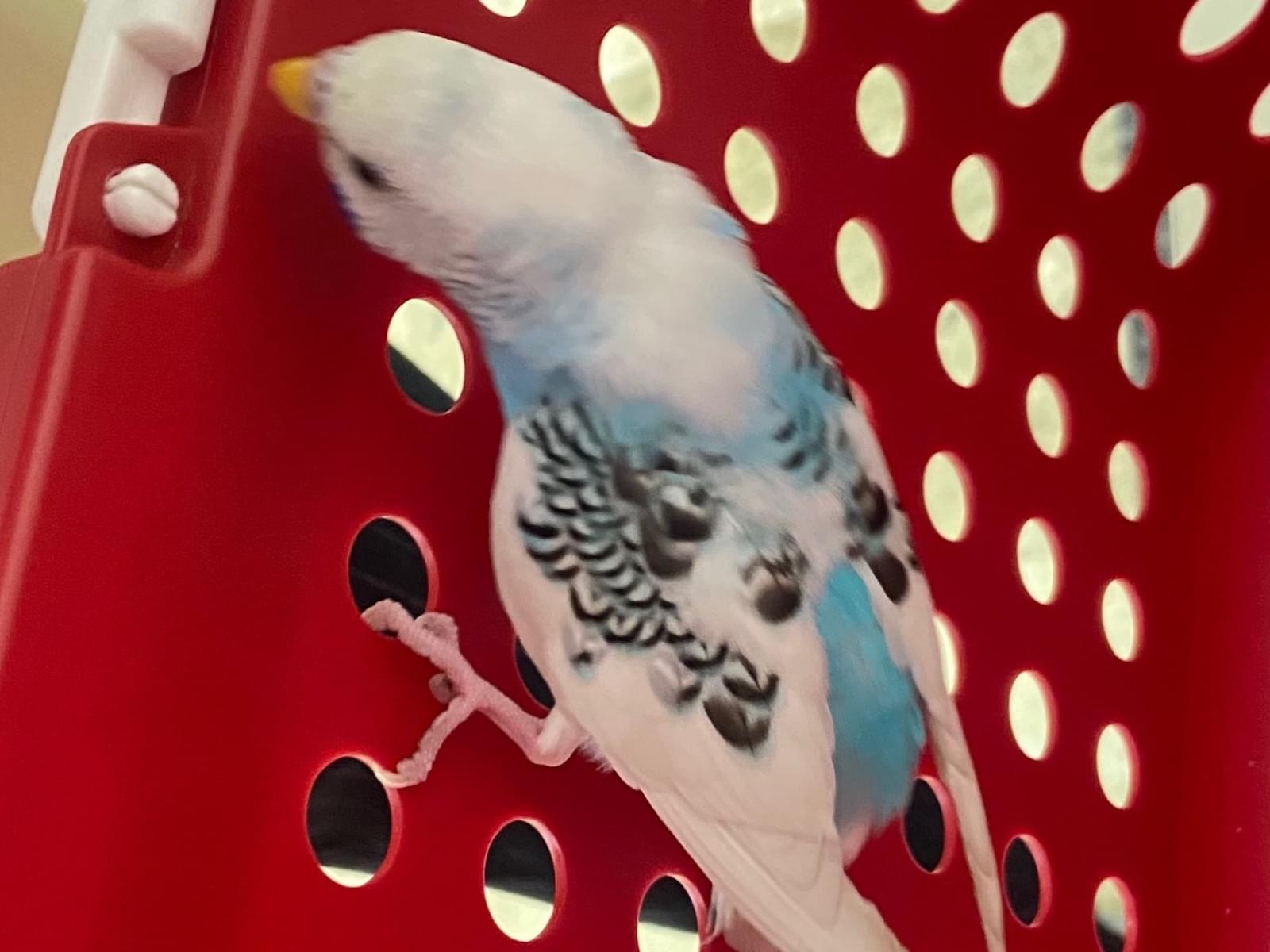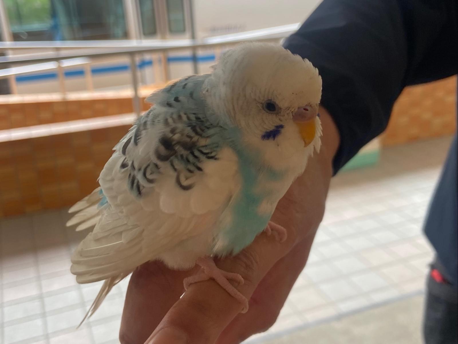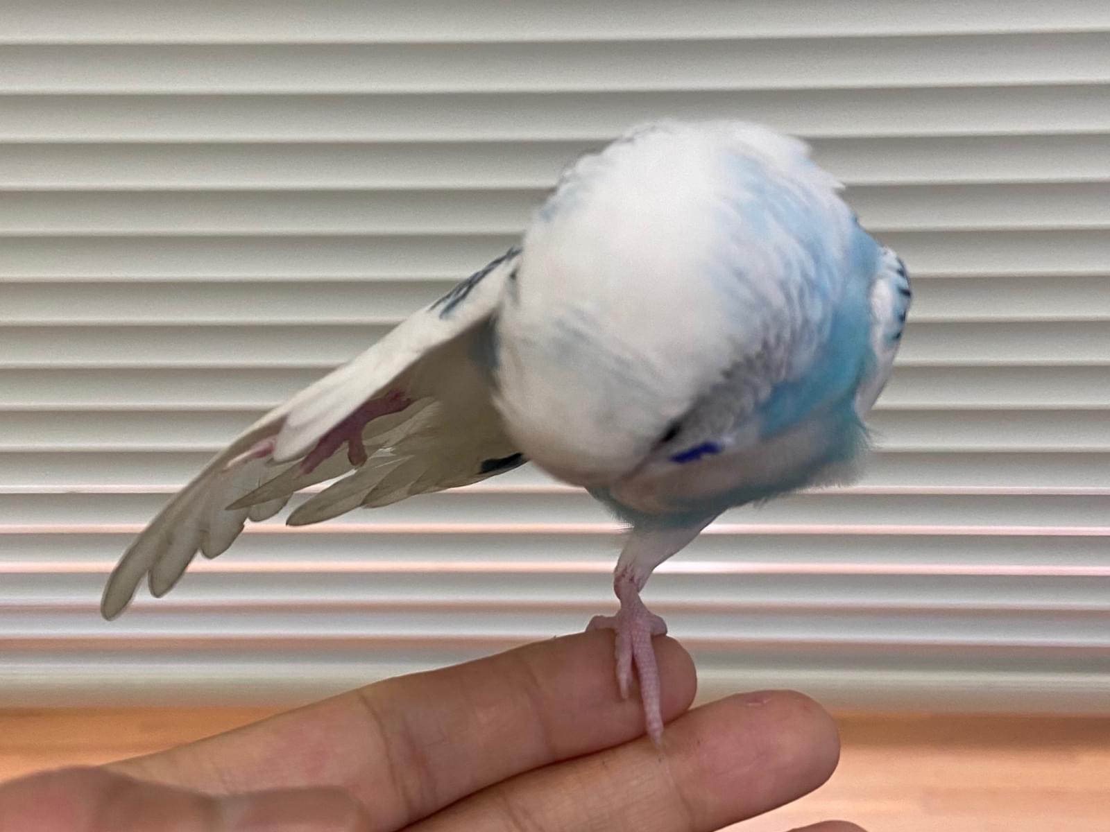 頭は白く、後頭部から顔にかけて少しグレーがかってます。胴体は胸が白く周りや背中が水色です。翼は白に黒い半円状の模様が入ってます。