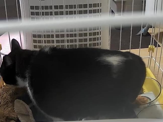 左耳さくらカット済、白黒ハチワレ、手は白で背中に白い模様があります。人馴れしている様子。