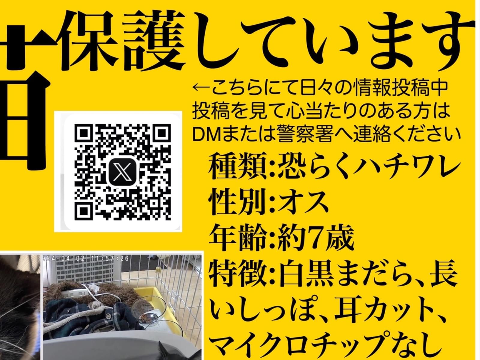 白黒まだら、おおよそ5-7歳、オス、左耳カット済、マイクロチップなし、背中に目立つ模様あり。手は白。