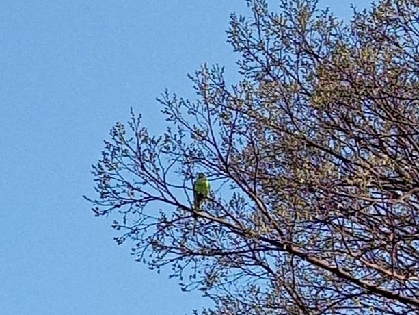 「ピーちゃん」と声をかけてみると、こちらの声を聞くように大人しくなったので、人に飼われていた鳥かもしれません。種類は分かりませんが、黄緑色で顔の辺りが赤いように思います。