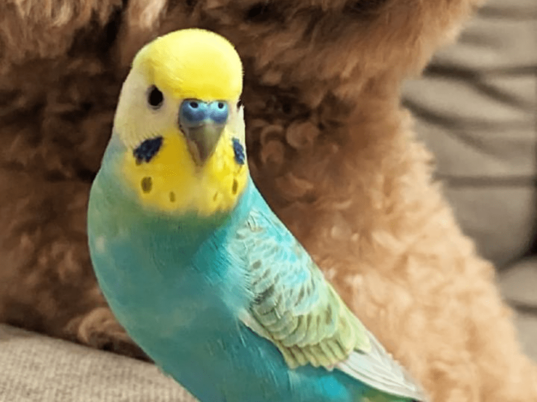 頭が黄色で体は水色のレインボーのセキセイインコです。