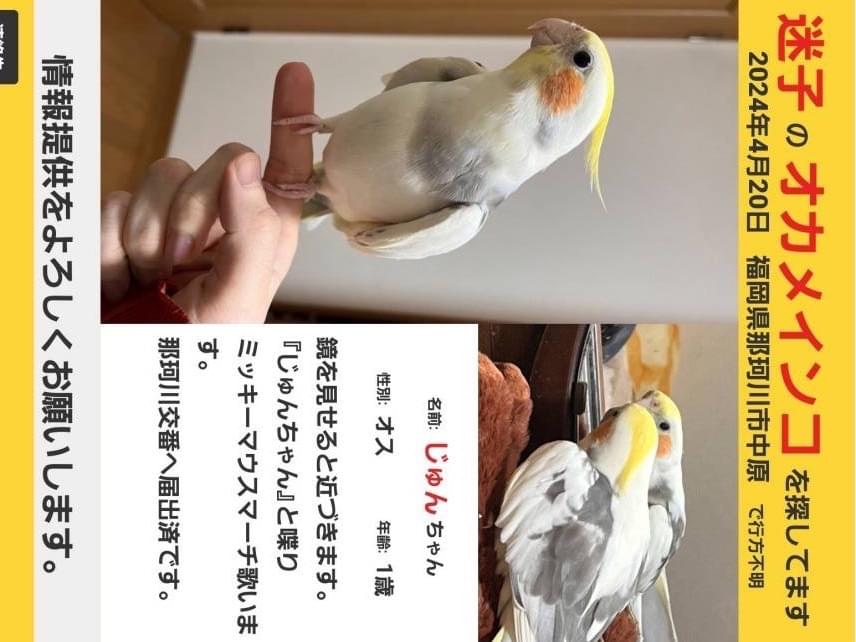 ホーム迷子鳥福岡県オカメインコを探して…オカメインコを探しています管理編集するポスター掲載終了最終更新日時:2024/04/25 10:30写真動画情報用件迷子名前じゅん性別オス年齢1歳場所福岡県 那珂川市中原発生日時2024年4月20日(土)飼い主うめ説明じゅんちゃんと自分の名前を言ったり、ミッキーマウスの歌を歌ったりします。鏡を見せると近寄ってきます。連絡先URL未設定掲示板情報交換のための掲示板です。ユーザーからの情報提供、オーナーからの連絡などにご利用下さいませ。書き込んだ情報は、オーナーのメールに通知されます。コメントを書き込む似たオカメインコの保護情報管理人返信0件2024/09/25 17:55