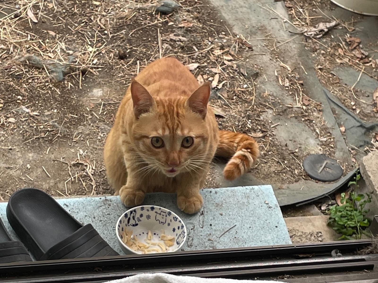 人を怖がってます。が離れるとゴハンは様子をうかがいつつ食べてました。
