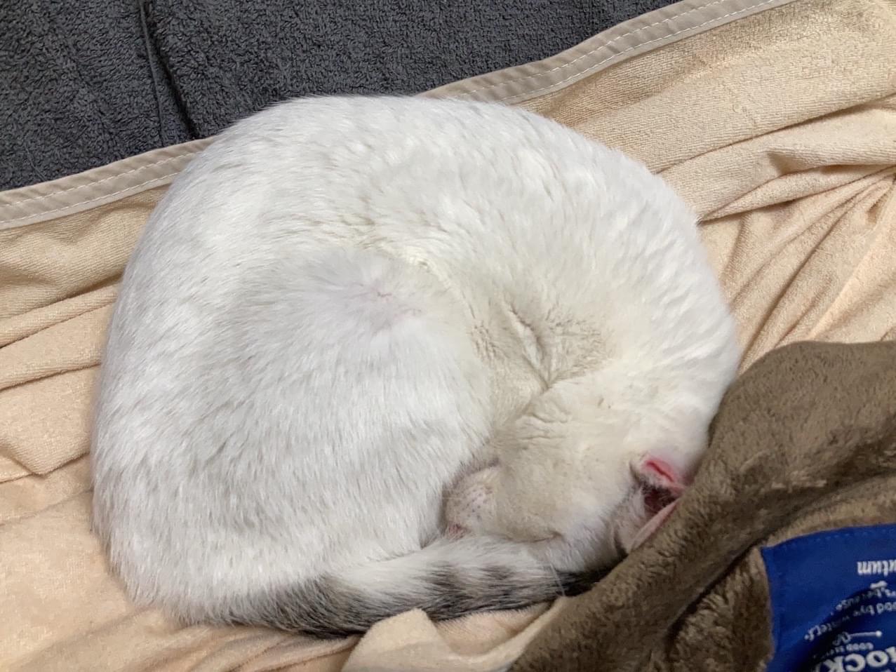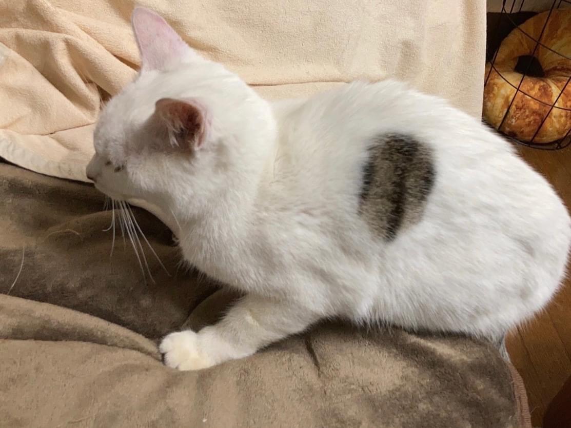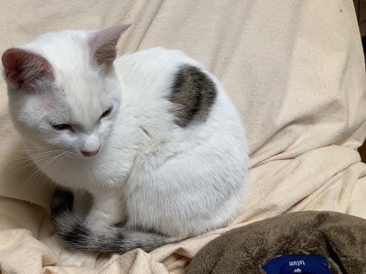 自宅周辺で保護しました。お腹と尻尾に模様の入った白猫です。人懐っこいのでどこかで飼われてた子かもしれません。お心当たりの方はご連絡ください