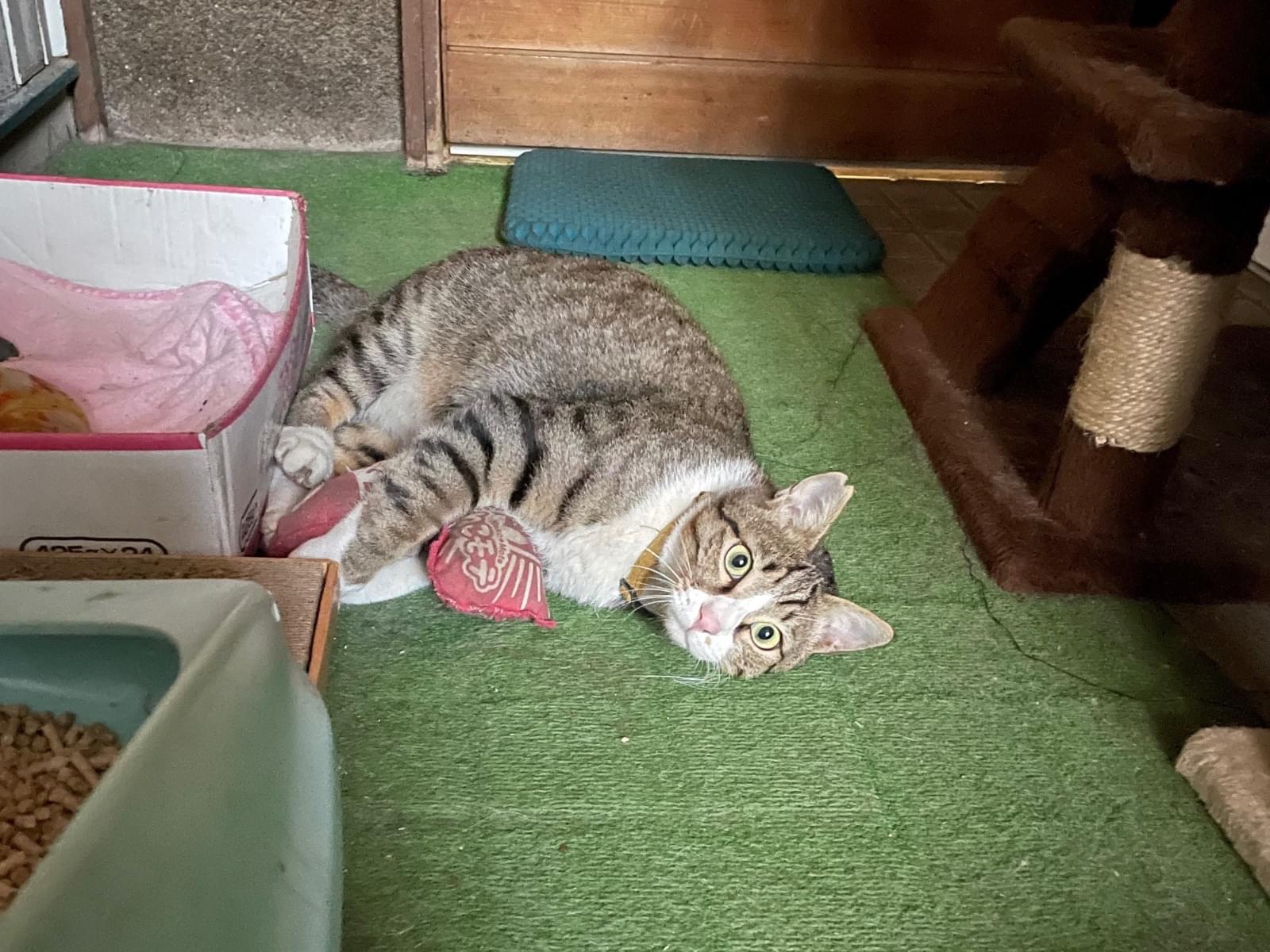 右前足はトラ模様で、左は白です。
