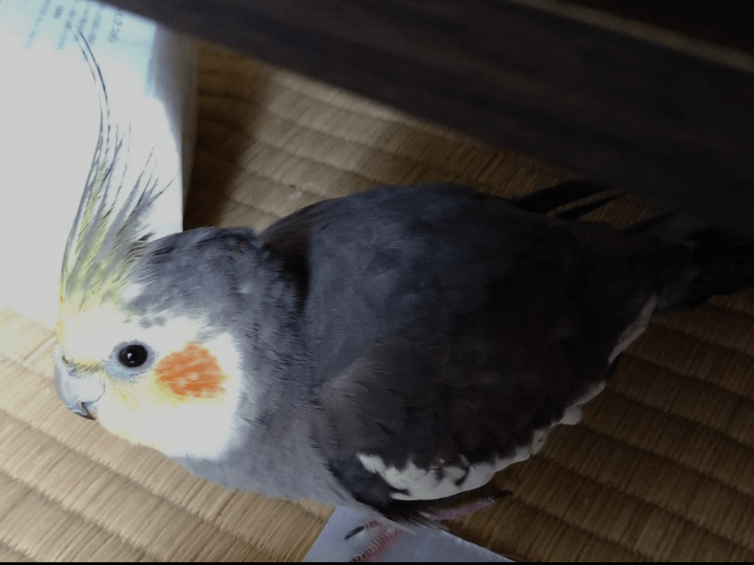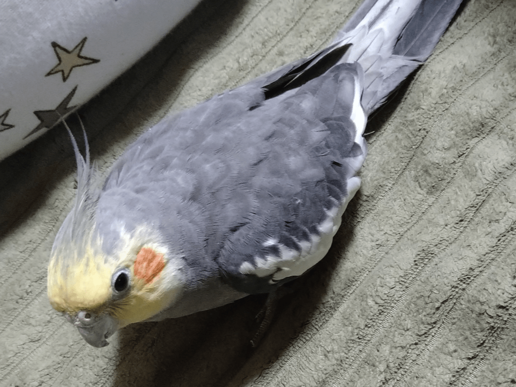 体はグレー顔が黄色ホッペがオレンジ色のインコ