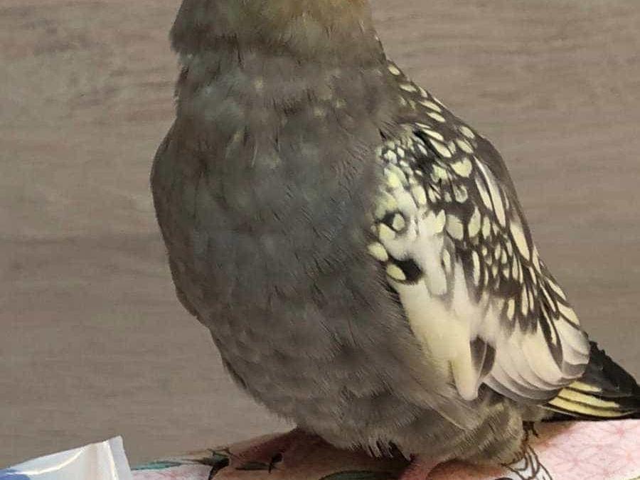 ・全体的にグレーですが、尾羽は黄色で背中とお腹に白い斑点があります