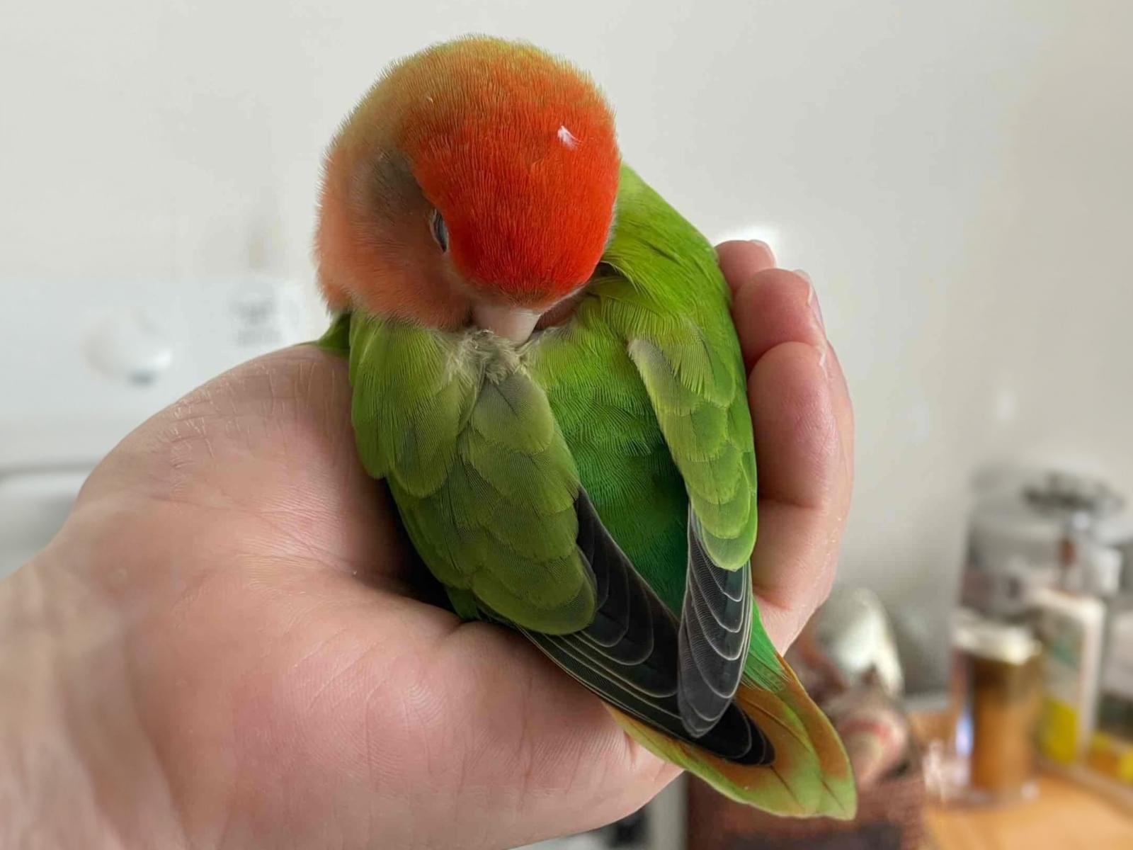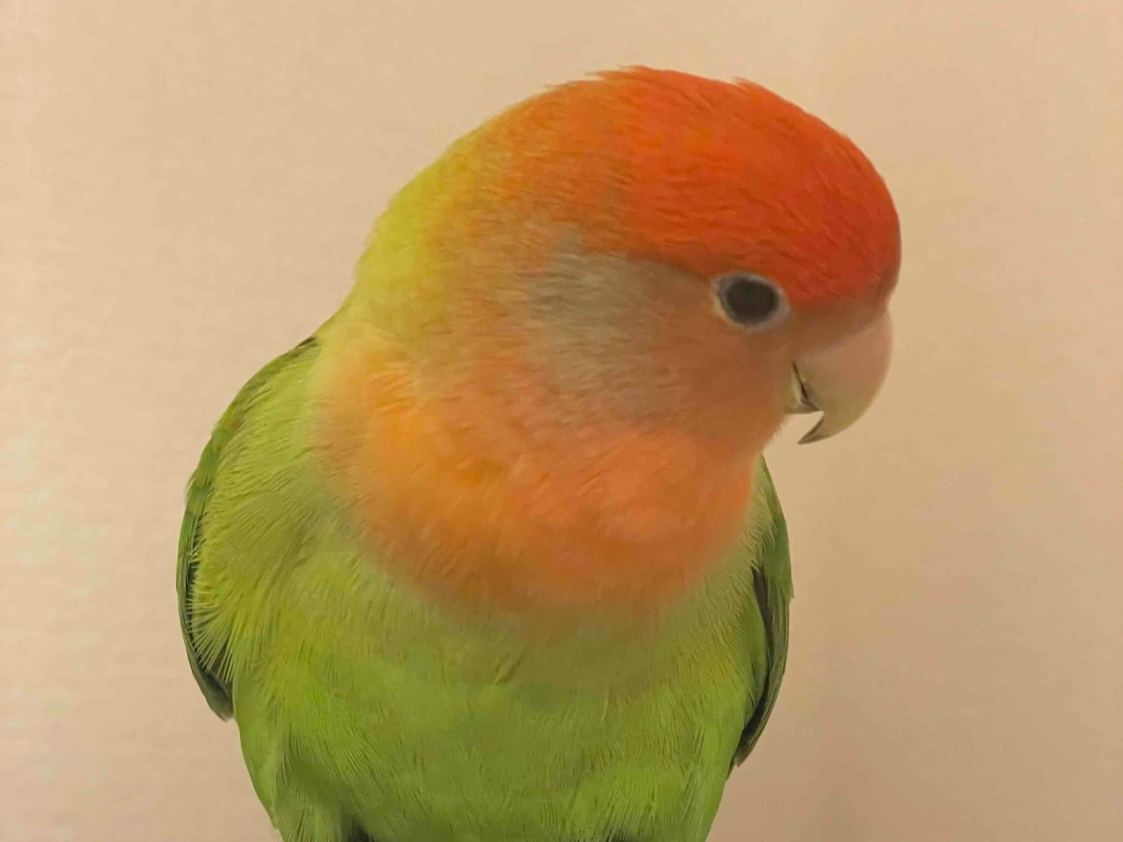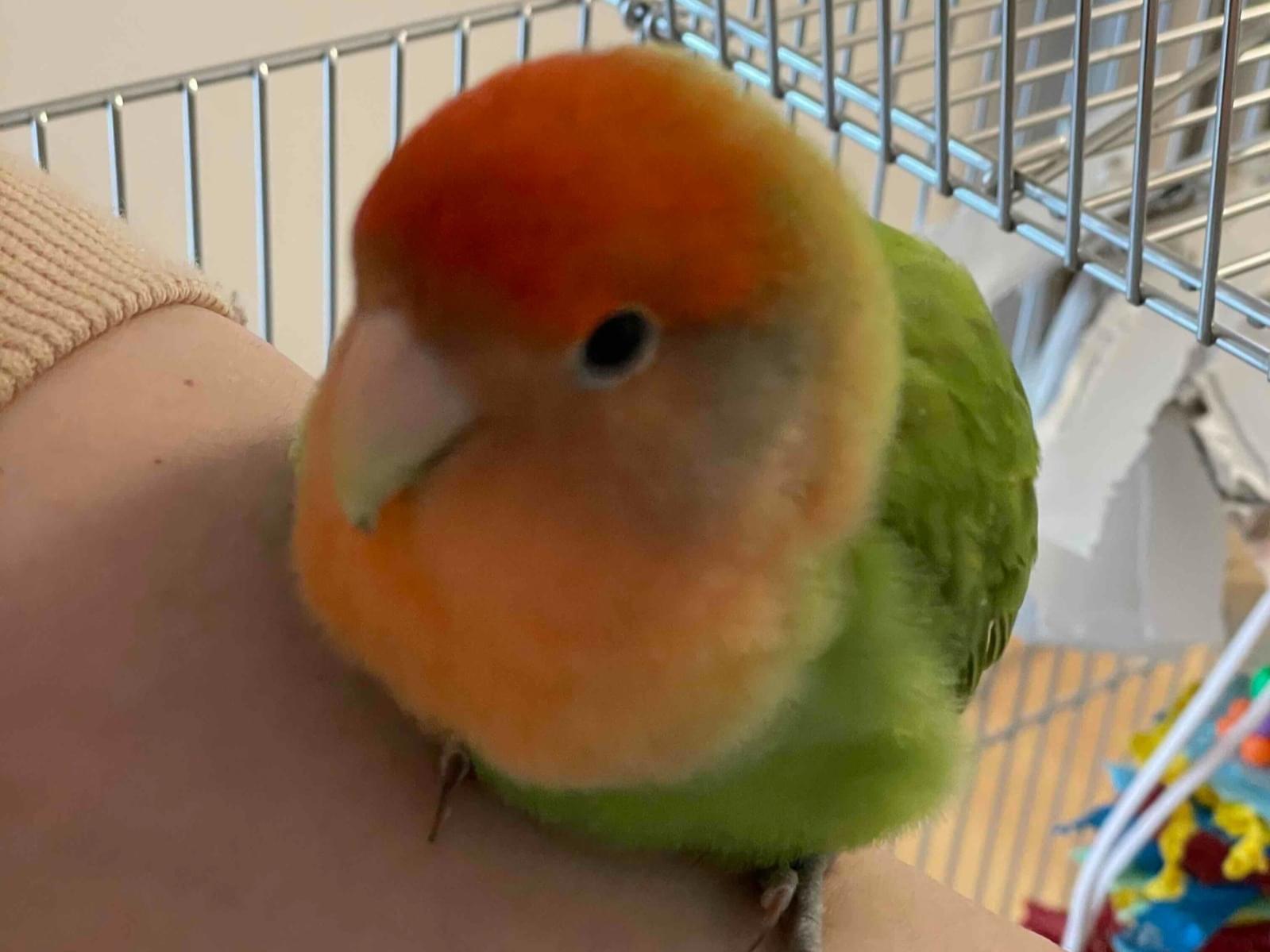 体は黄緑色、頭はオレンジ色のオパーリンです。気が強く手には乗りますが噛む力が大変強く捕獲は苦労するかもしれません。クリッピングはしていないので飛べます。名前ははなです。