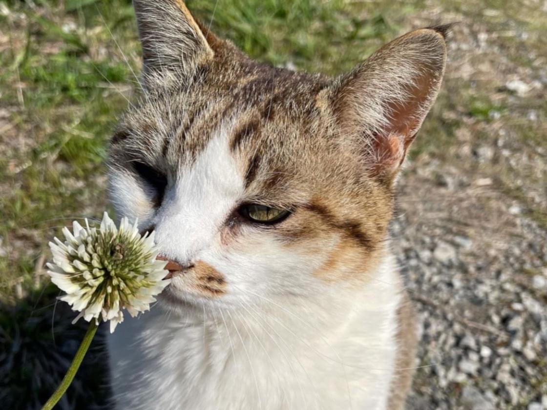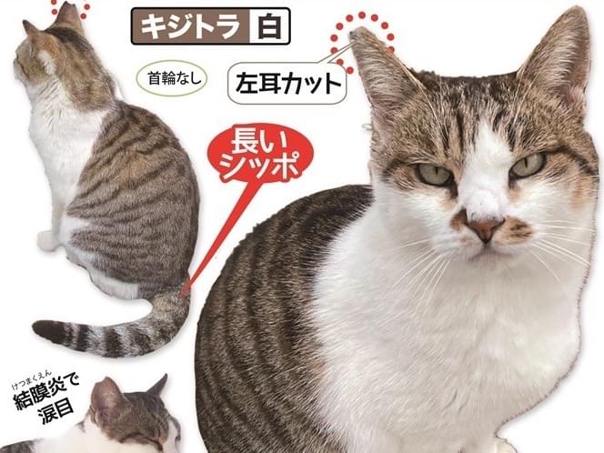 キジシロ、男の子。目の色はグリーン。尻尾は長い。鼻の頭にブチ柄。結膜炎で涙目。眼薬をずっと点眼していました。