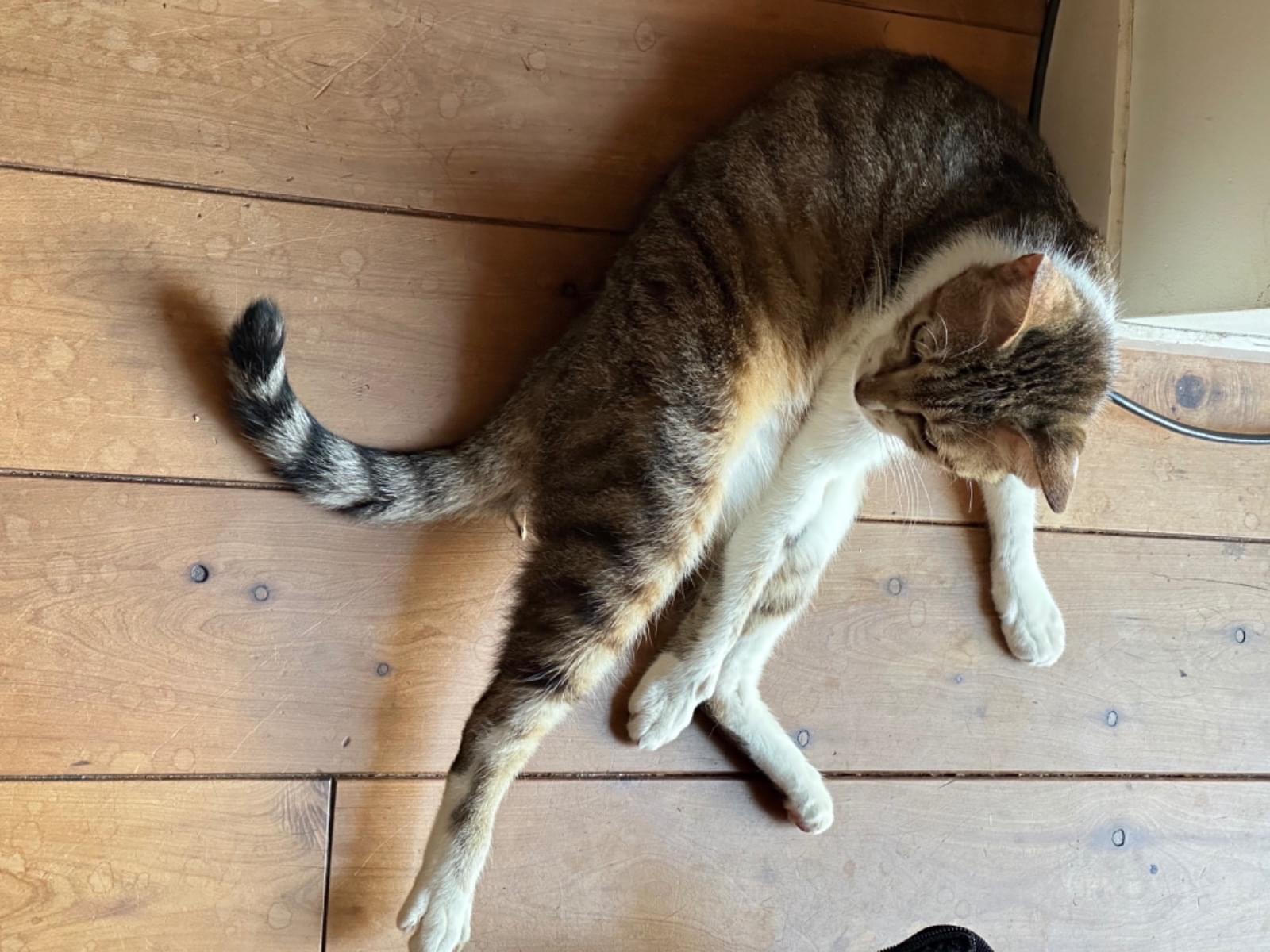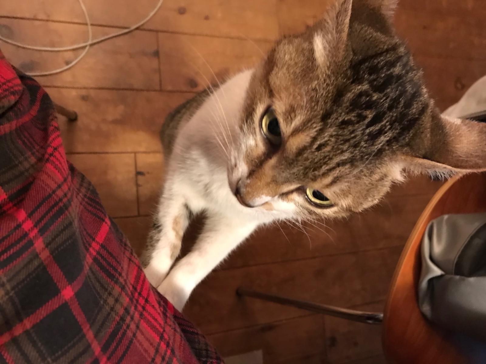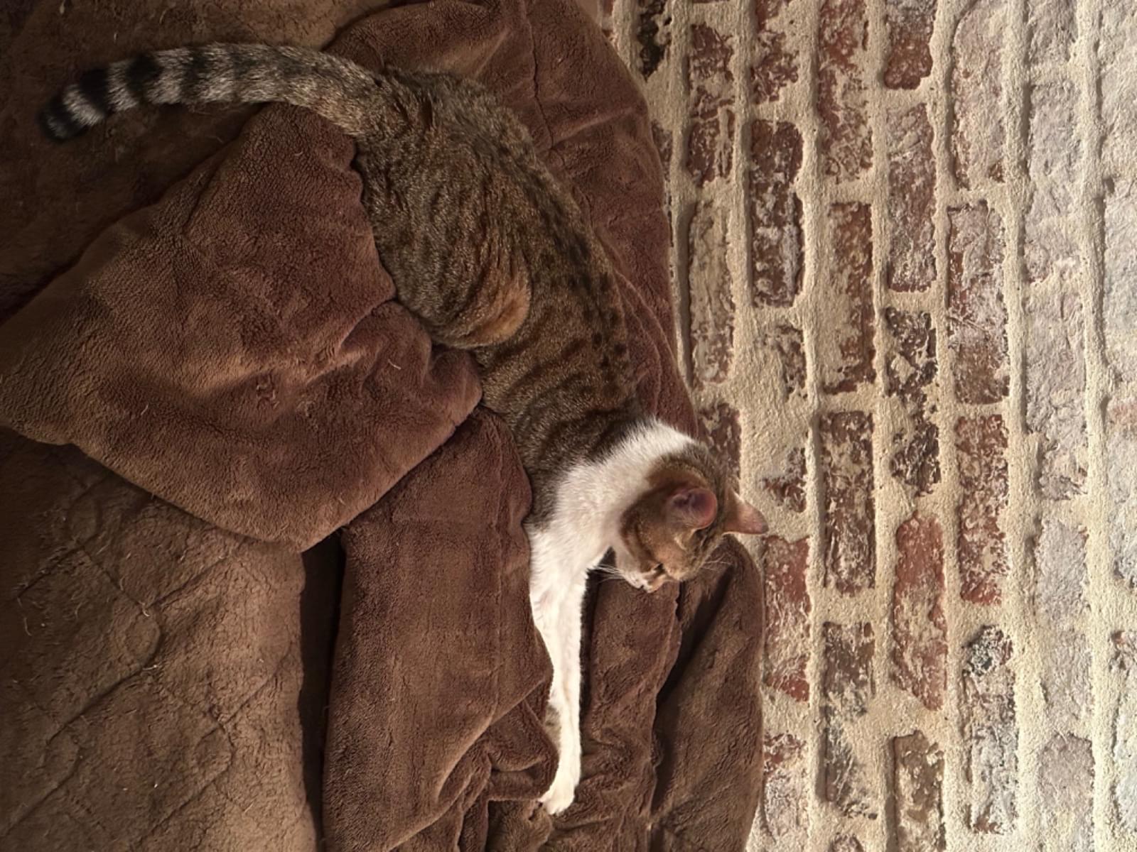 泣き声は小さめです。興奮すると長いトラ模様の尻尾の毛が立ち太くなります。カシャカシャ音がするレジ袋などビニールを噛む癖と、ストレスを感じると前足上腕部と胸部の毛を抜きます。