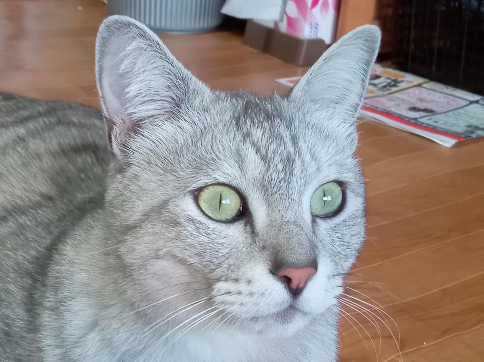 灰色のアメリカンショートヘアで、外慣れしています。かぎしっぽで、家族以外には懐いていません。夜に家から出ていったきり戻っていません。首輪はつけていないです。
