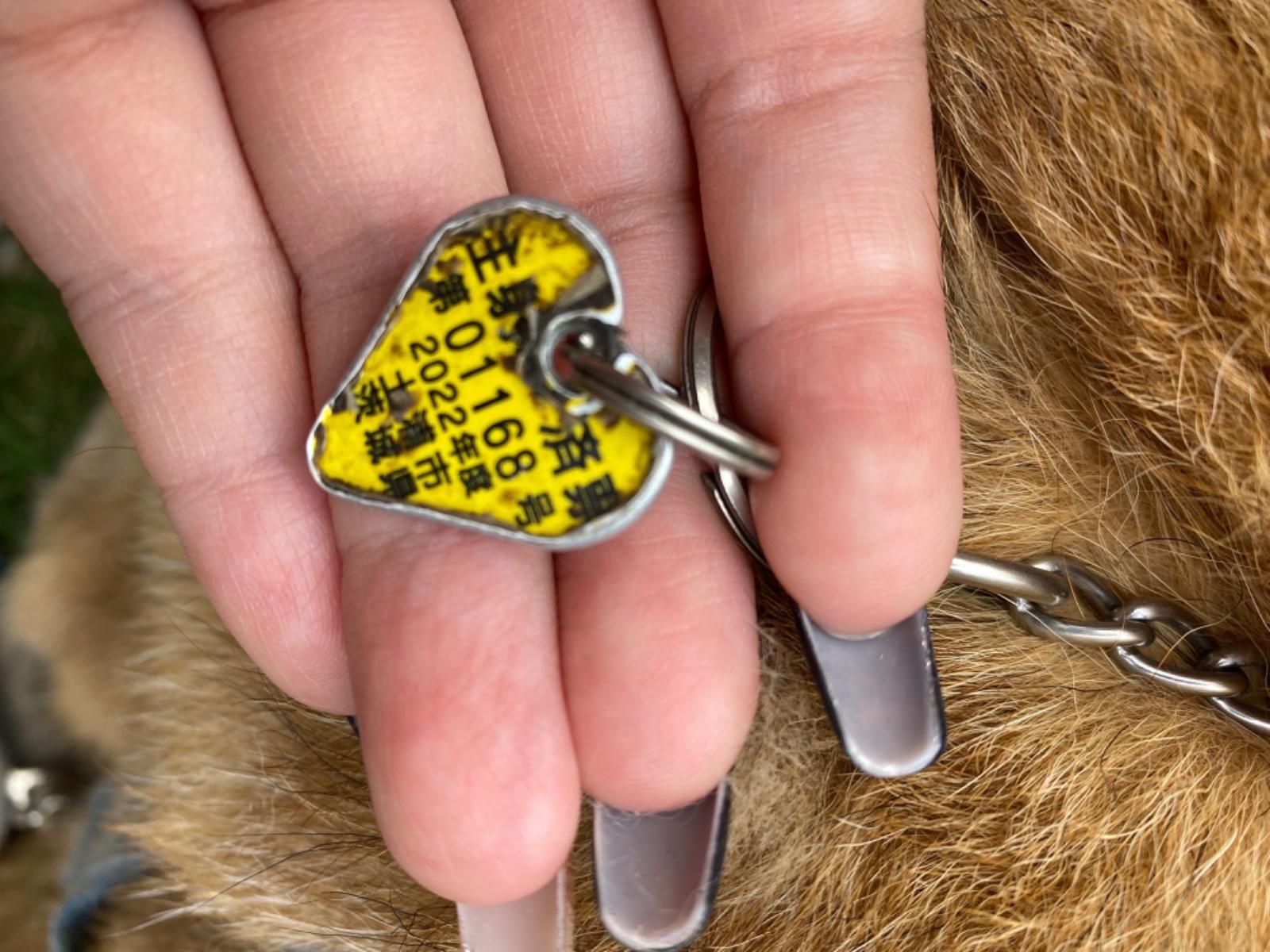 青の胴輪と狂犬病予防接種済みチャーム(2022年度のもの)のみ付けていました。マイクロチップなし。