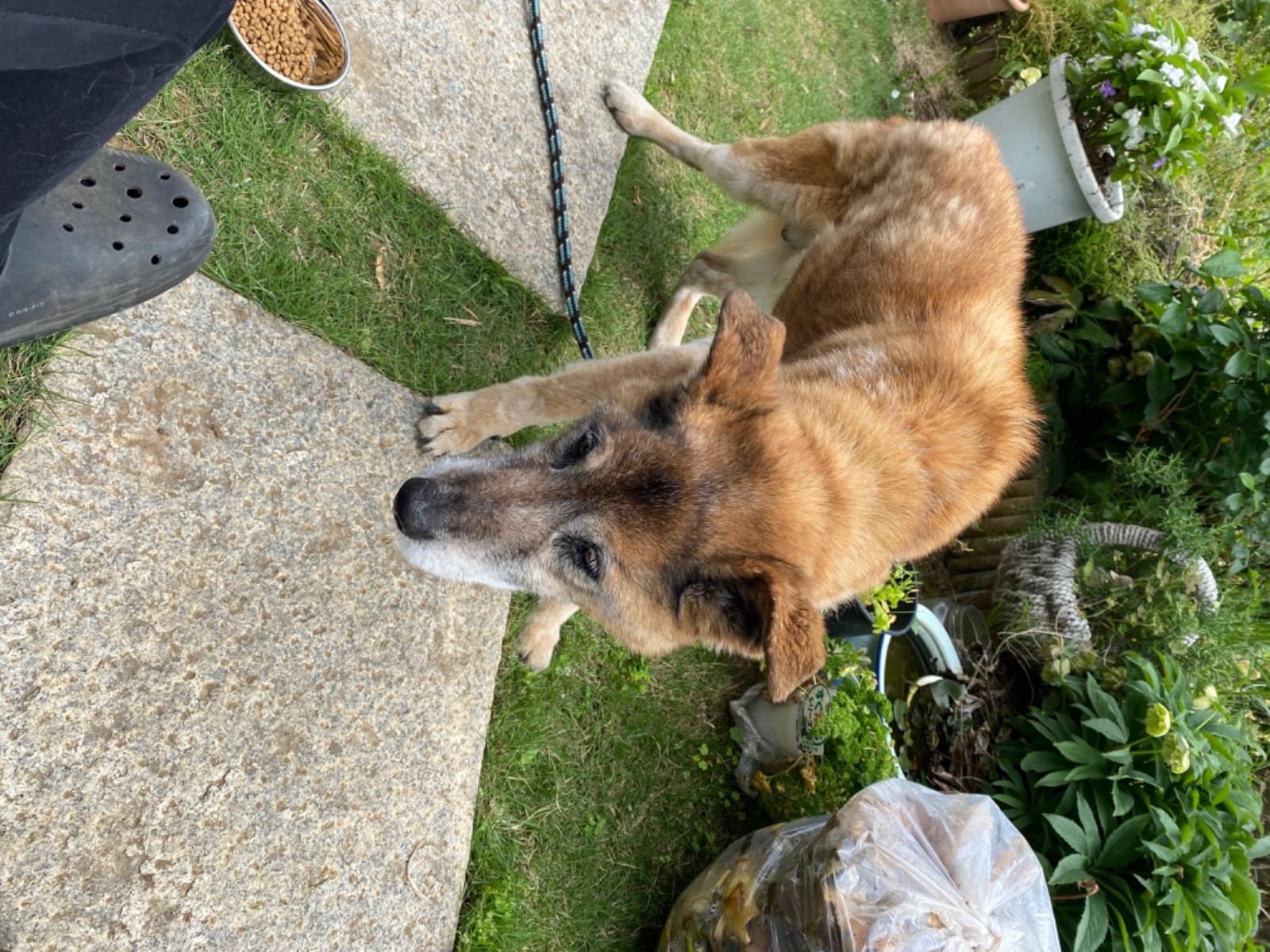 換毛期で毛がまだら。痩せ気味でシェパードくらいの大きさの雑種です。とても穏やかな性格で、人懐っこいです。