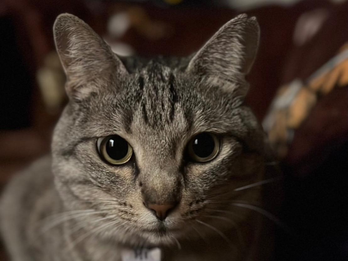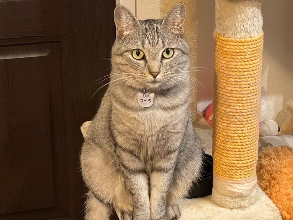 鈴付きの首輪に迷子札をつけており、名前と連絡先が記載されてます。