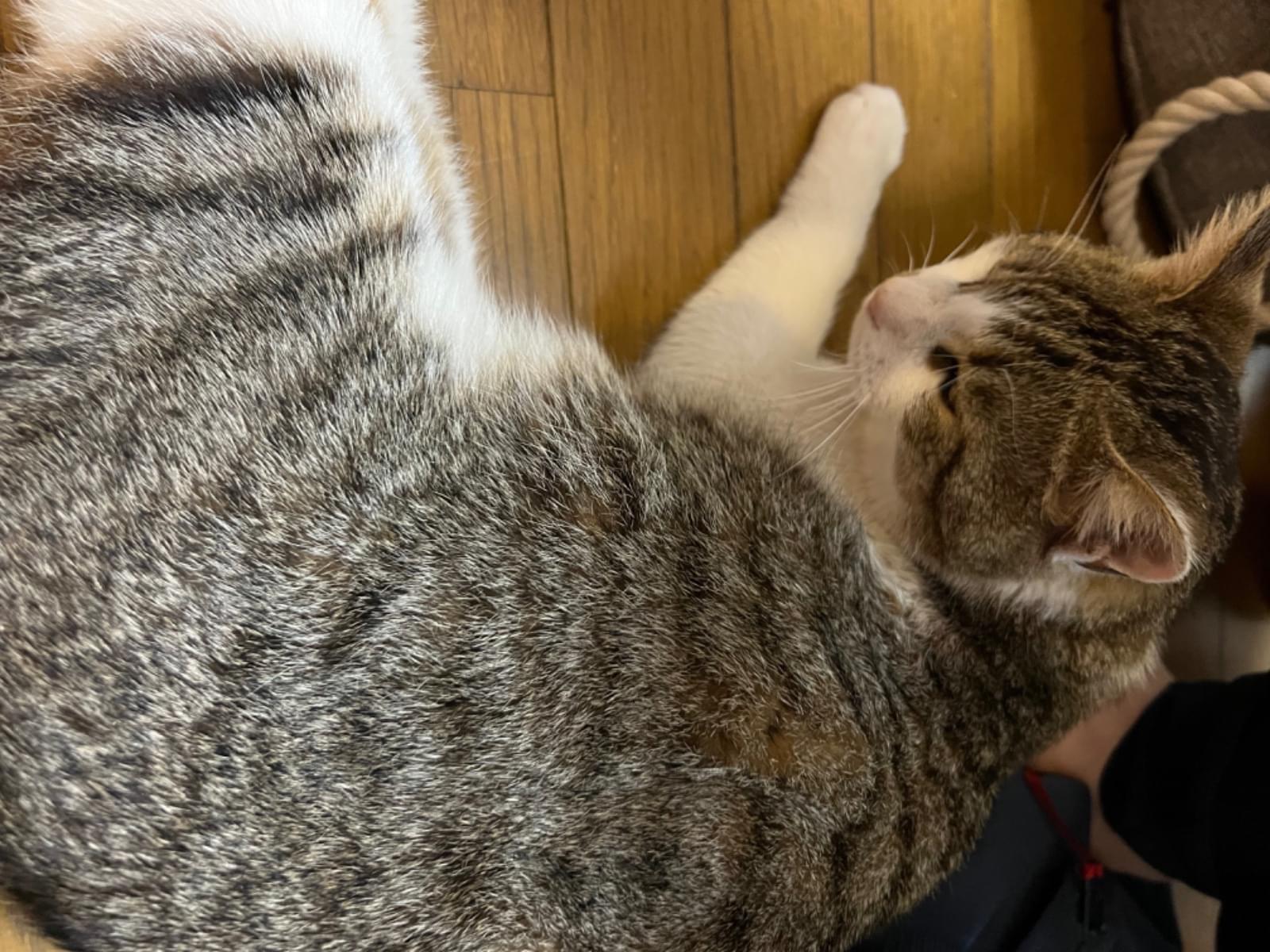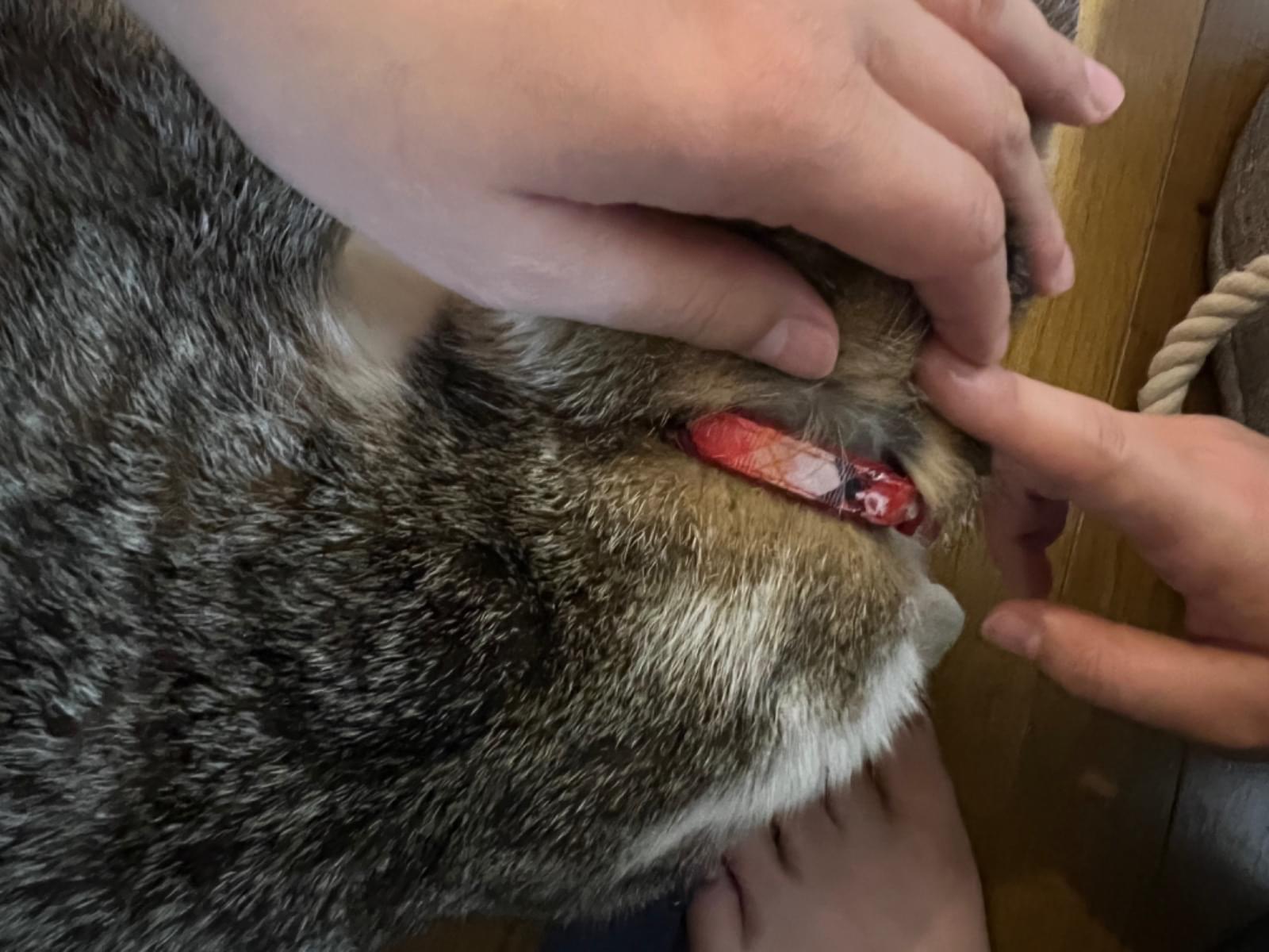 キジトラ、口と鼻横に模様あり、尻尾を怪我しています。