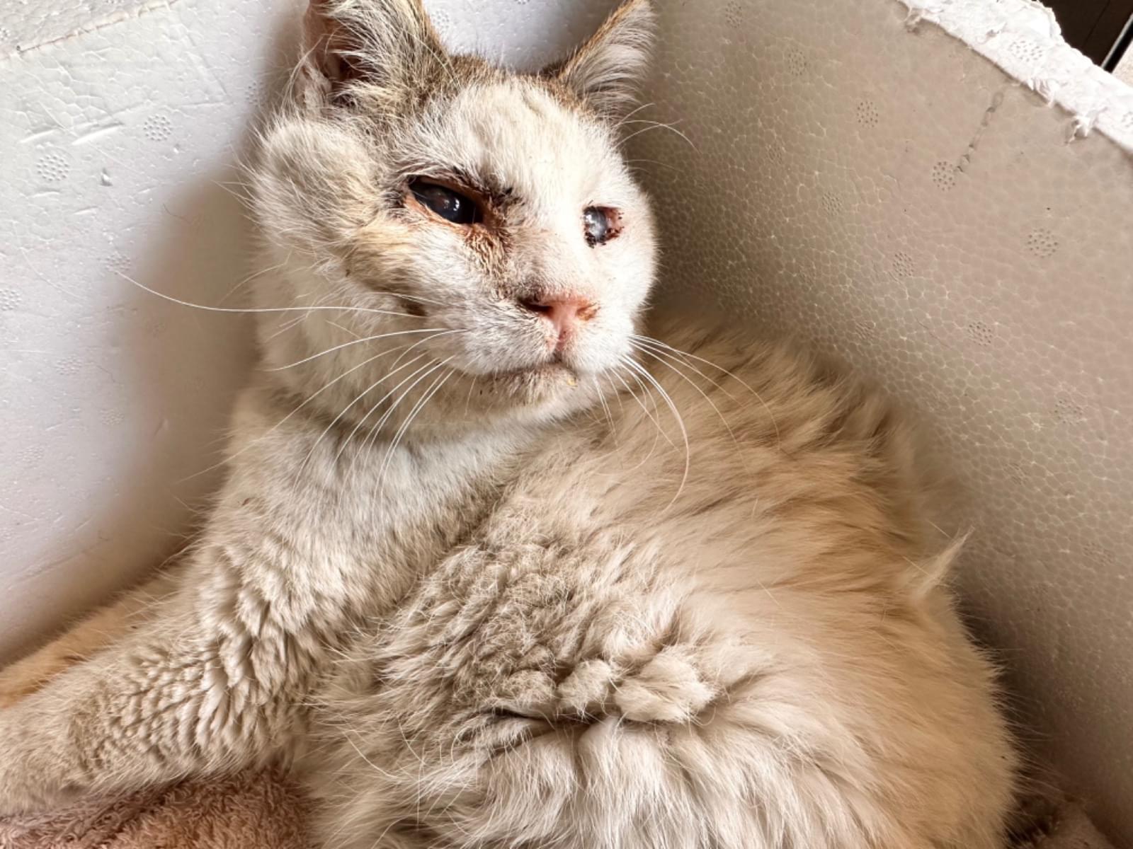 目は青色ですが、おそらく両目とも見えていなくて、あまり開けられない感じです。