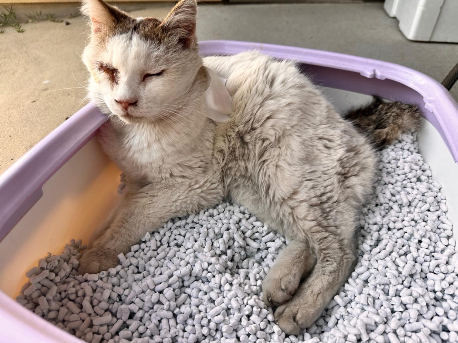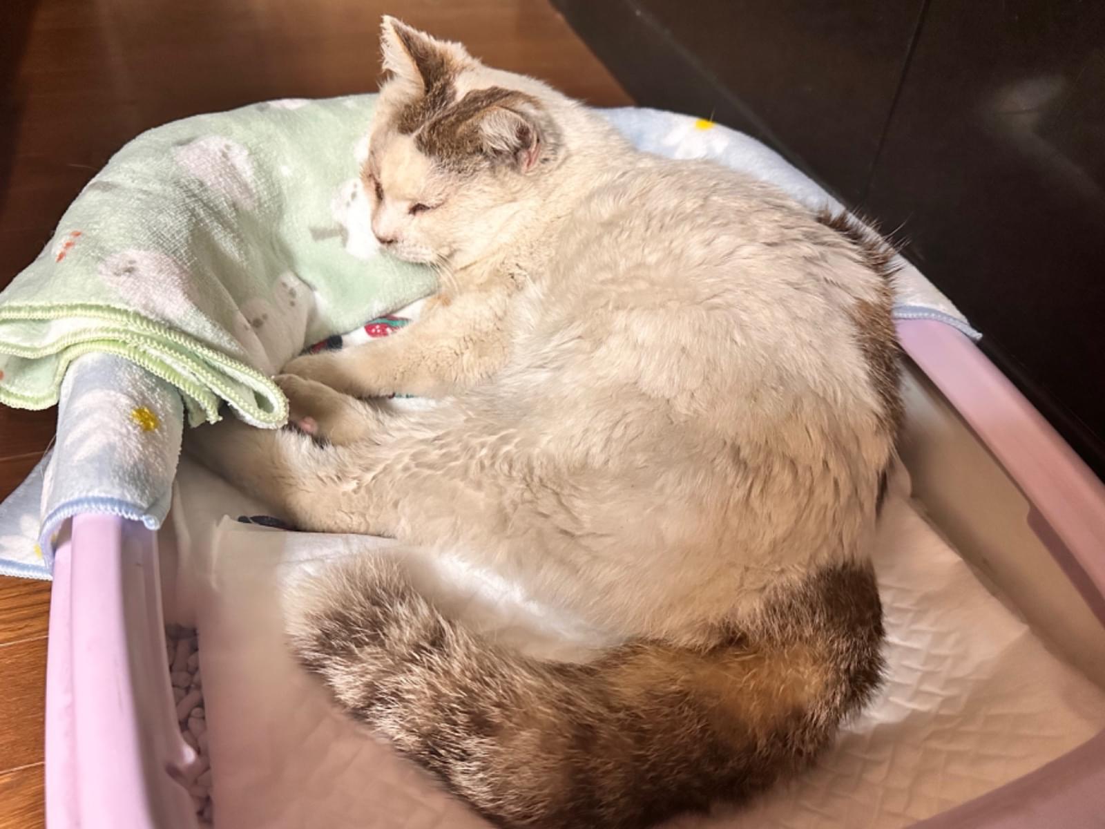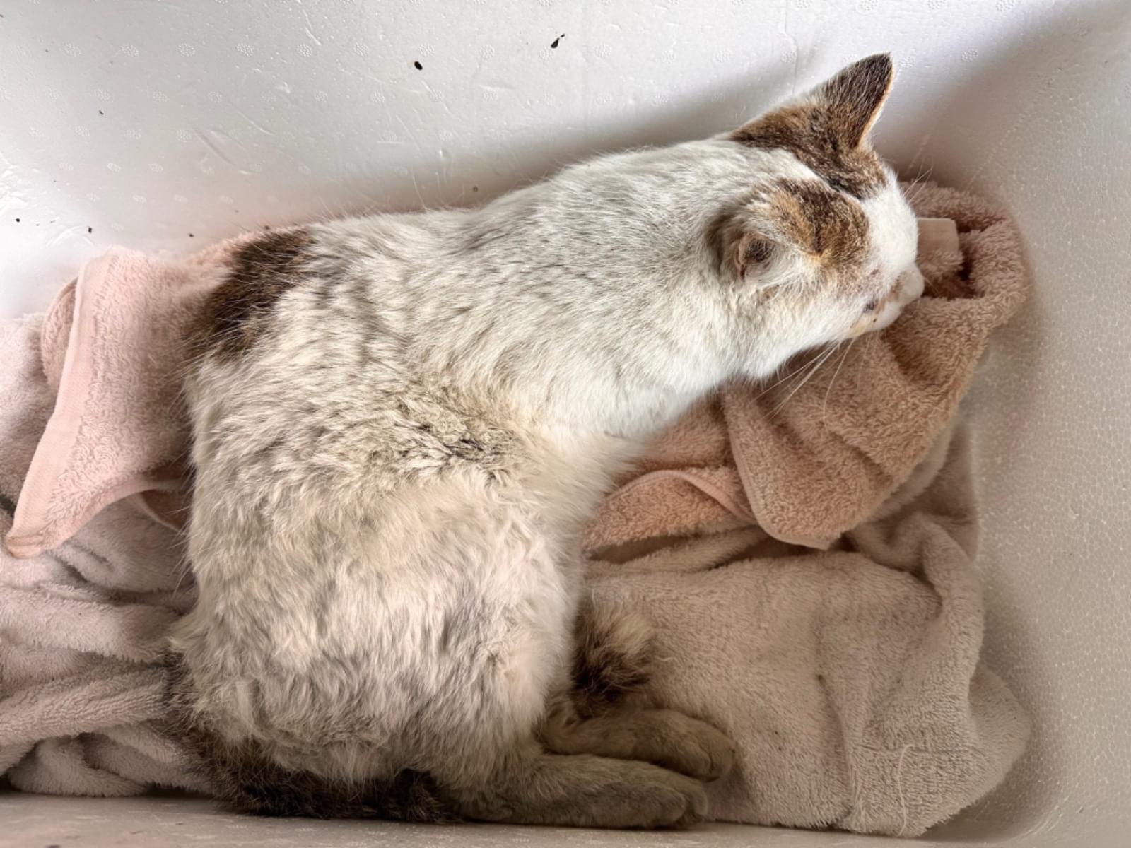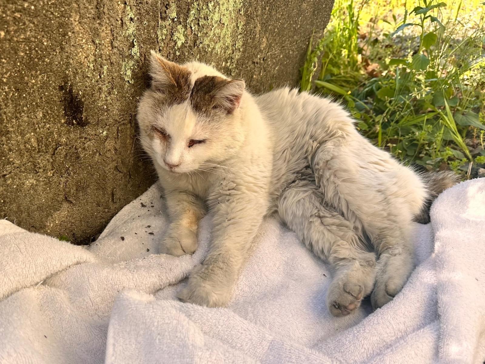 動物病院に連れて行き、抗生剤注射と点滴をしてもらい、保護当時よりは少し元気になってきたような気もしますが、食事は人が与えないと食べられない状態です。