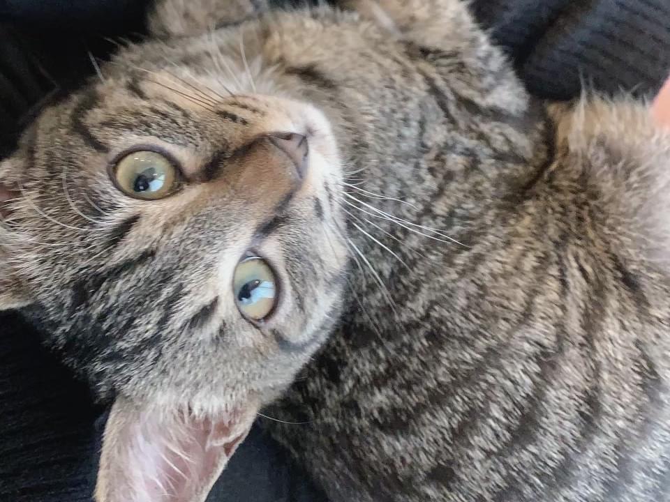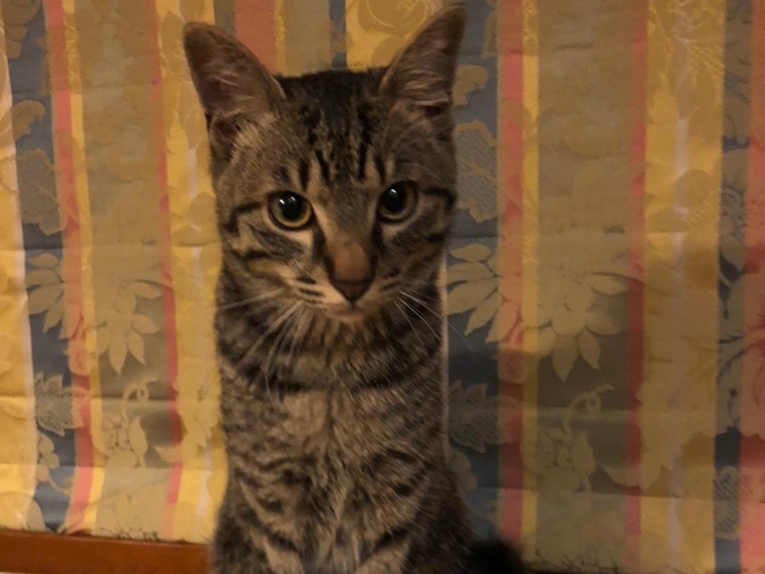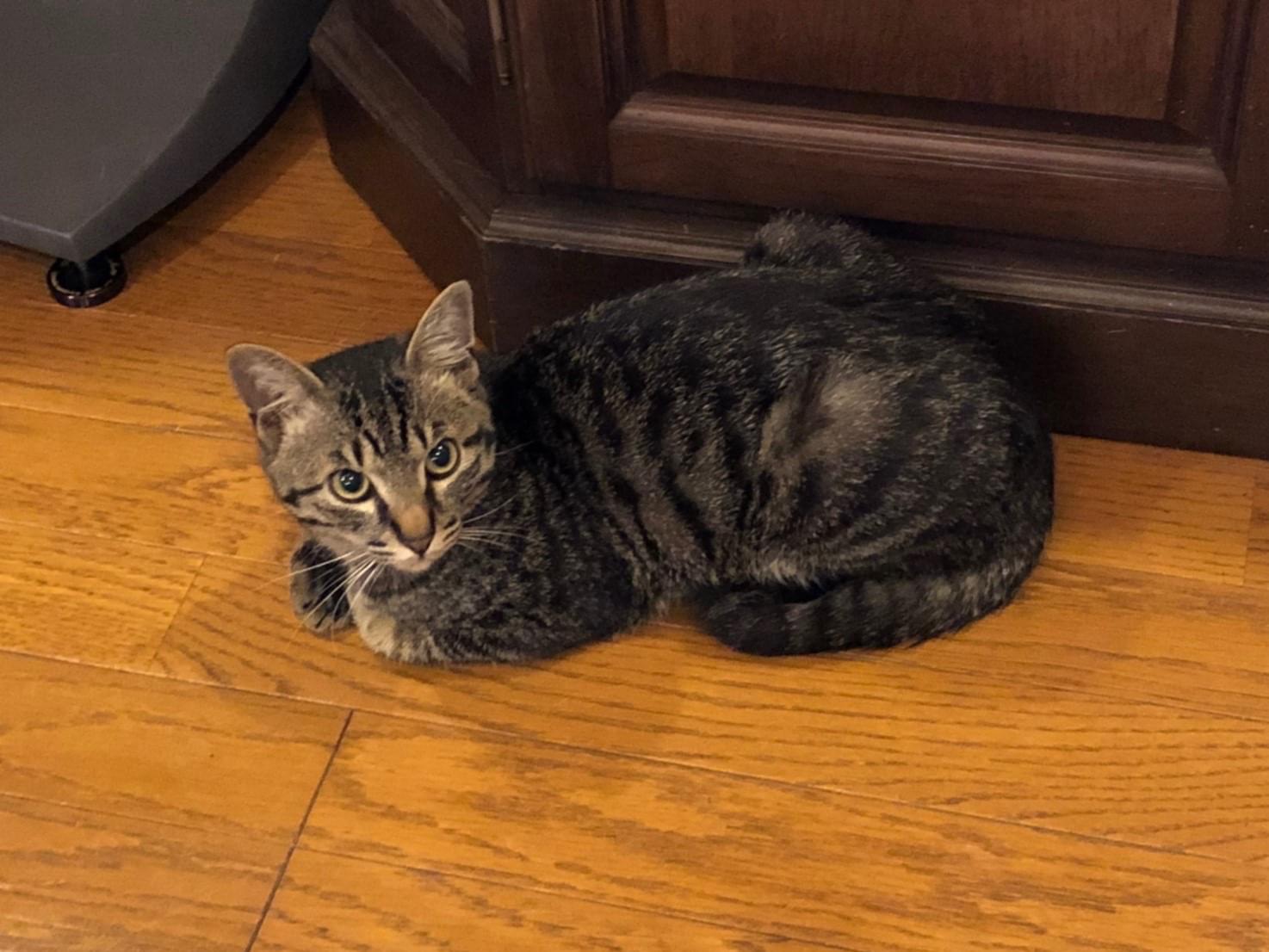 黒のキジトラ、長く細い鍵尻尾、丸い目、小さな丸い顔