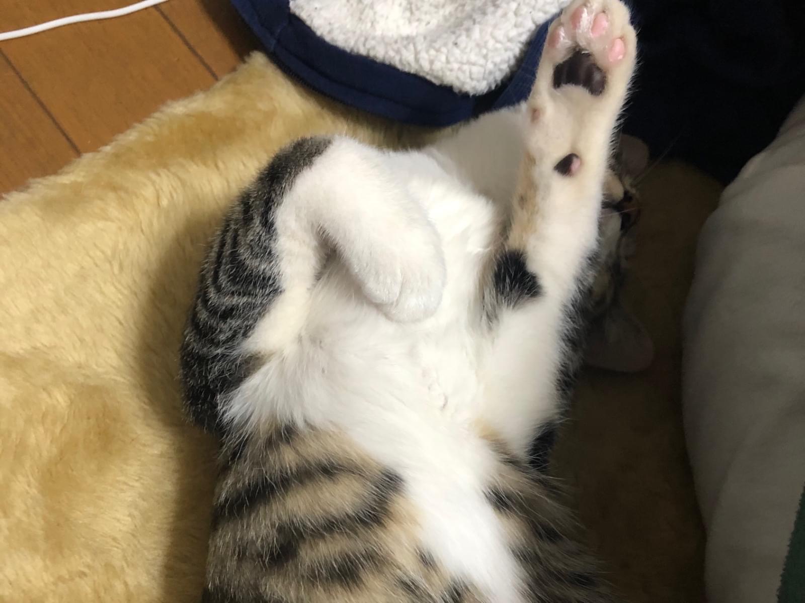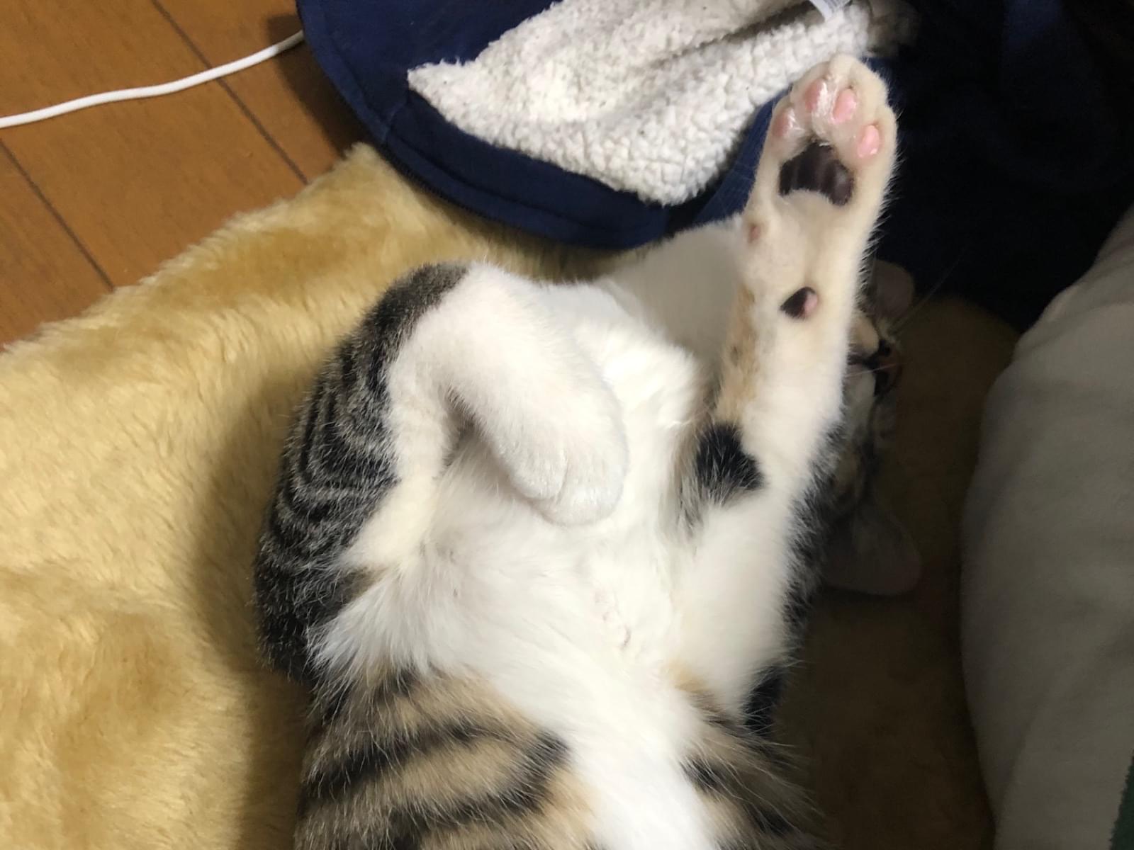 特徴は背中に1箇所、白い模様があり、左前足の肉球が1部黒くなっています。