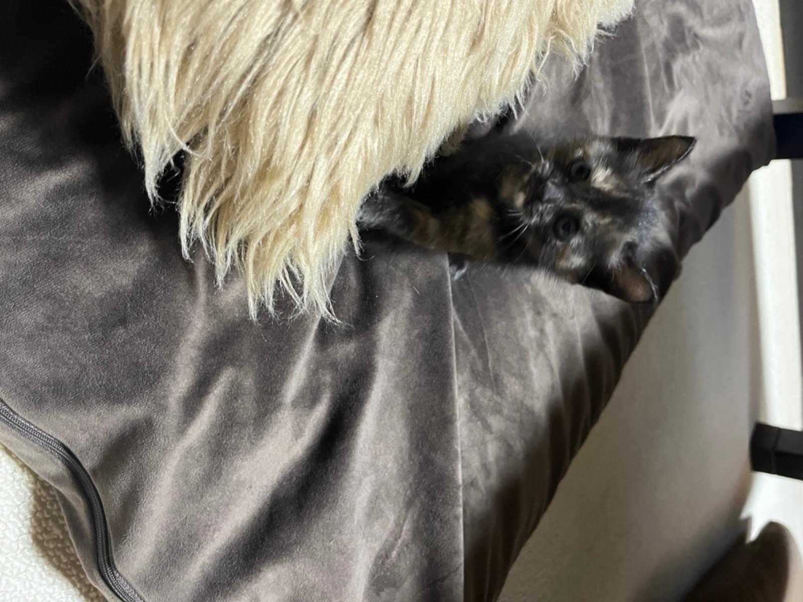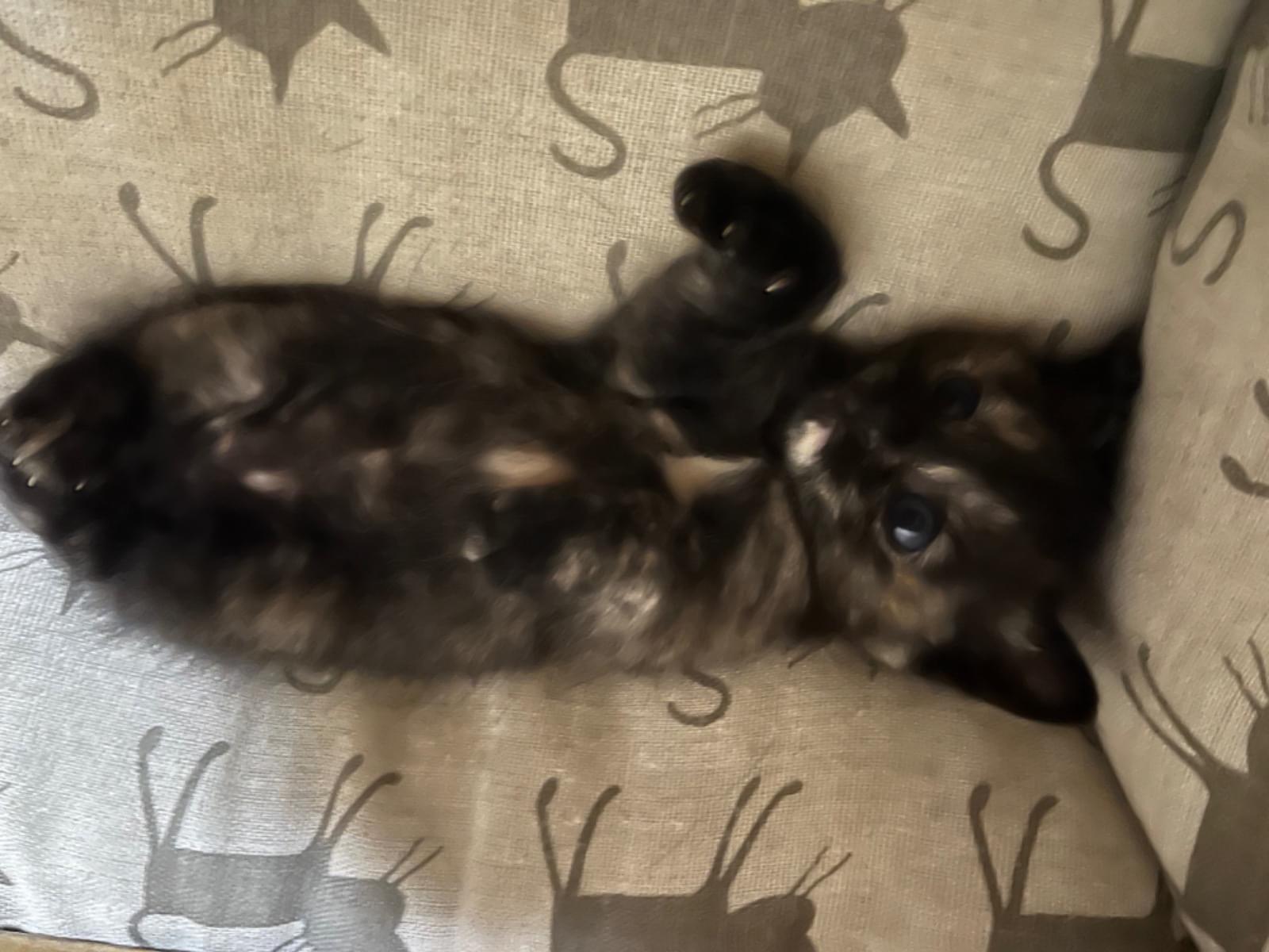 顔はお目目がクリクリで瞼にはマロのような柄が特徴的です。当時赤で金すずの首輪をつけていました。