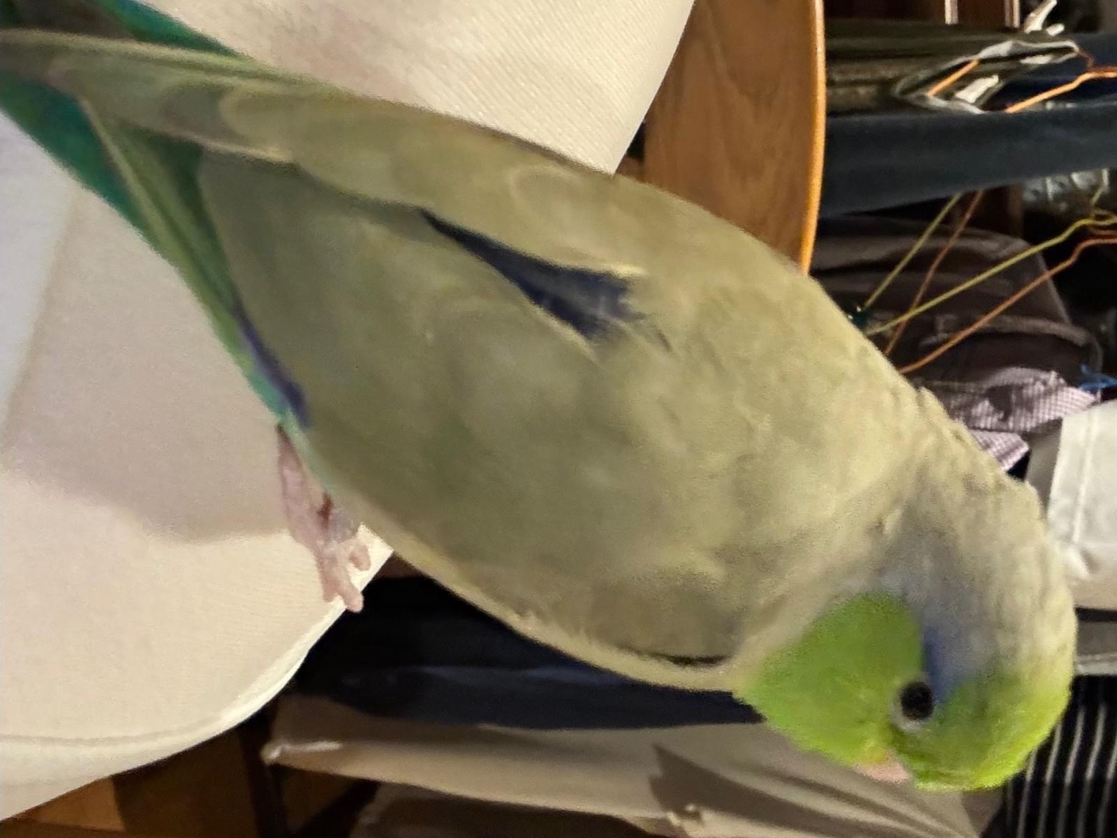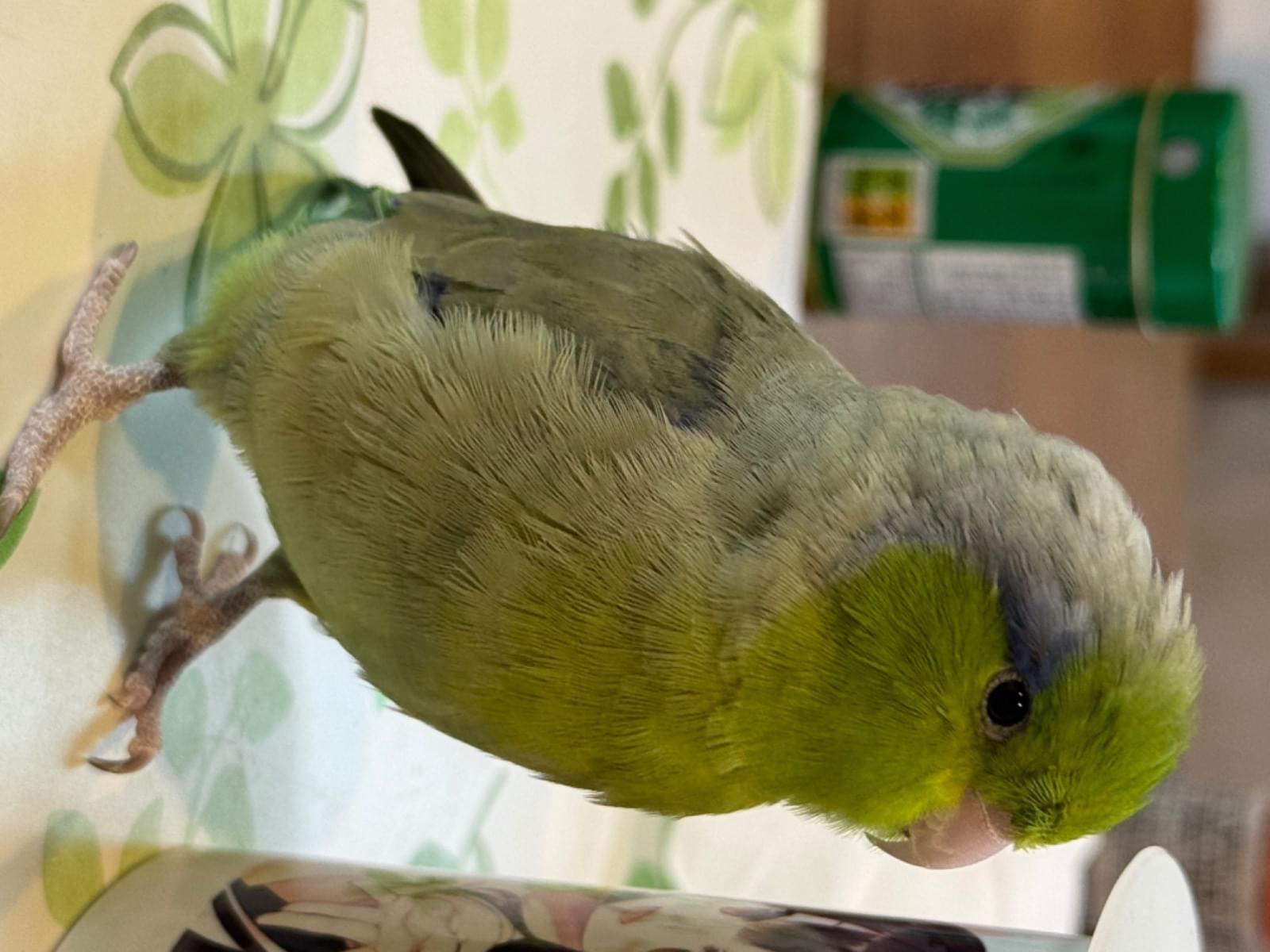全体的にグリーンで、目の後ろ・羽の先・背中に瑠璃色のアクセントが入っています。