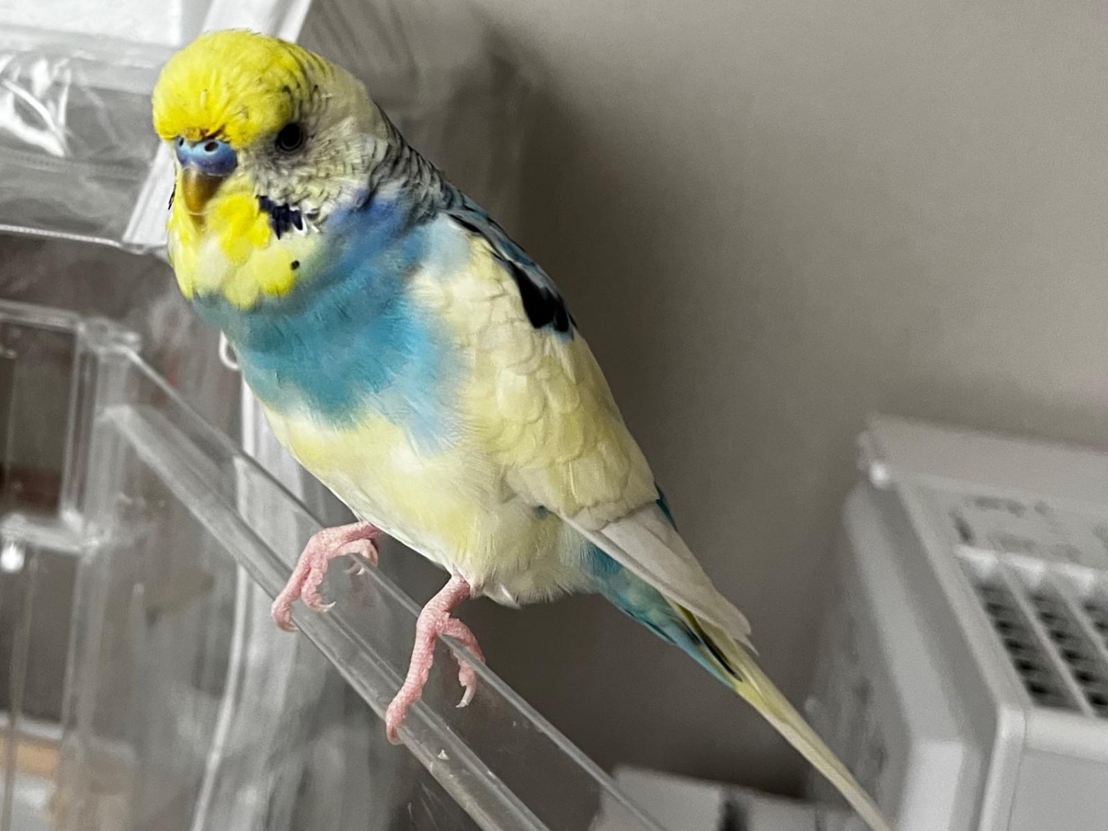 頭が黄色で身体が青と白、背中に斑点があるセキセイインコを捜しています。