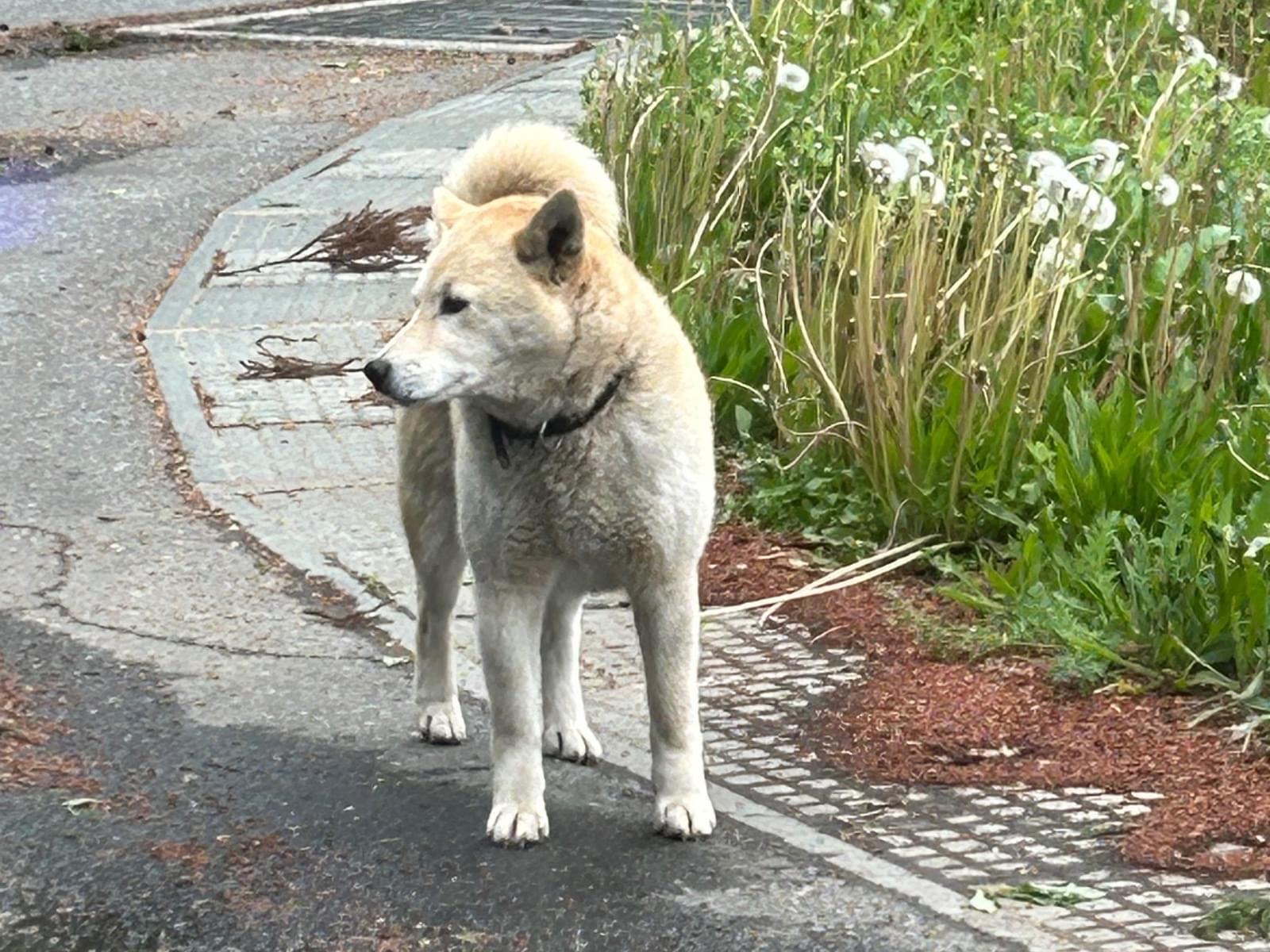 茶色っぽい首輪を付けた白い?犬です。(背中側が少し薄茶色)