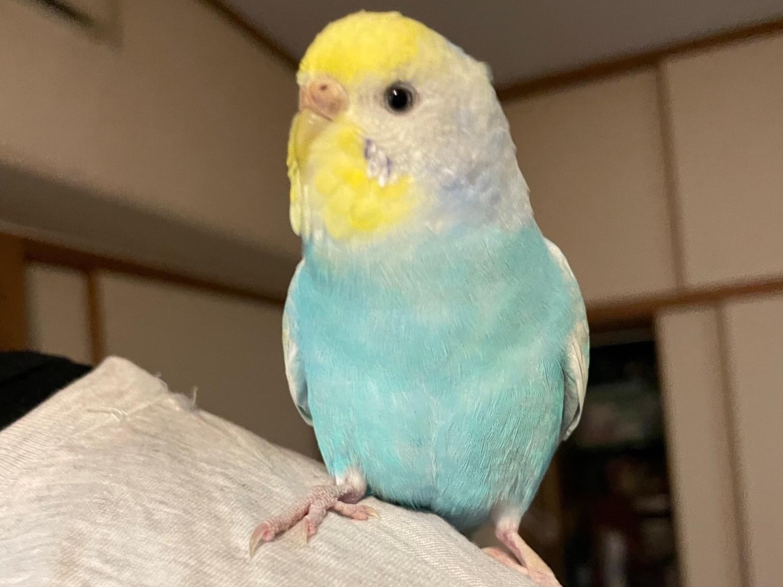 顔は黄色、身体は全体的に薄い黄色とグリーンぽいブルーのメス。とても人懐こく手乗りです。