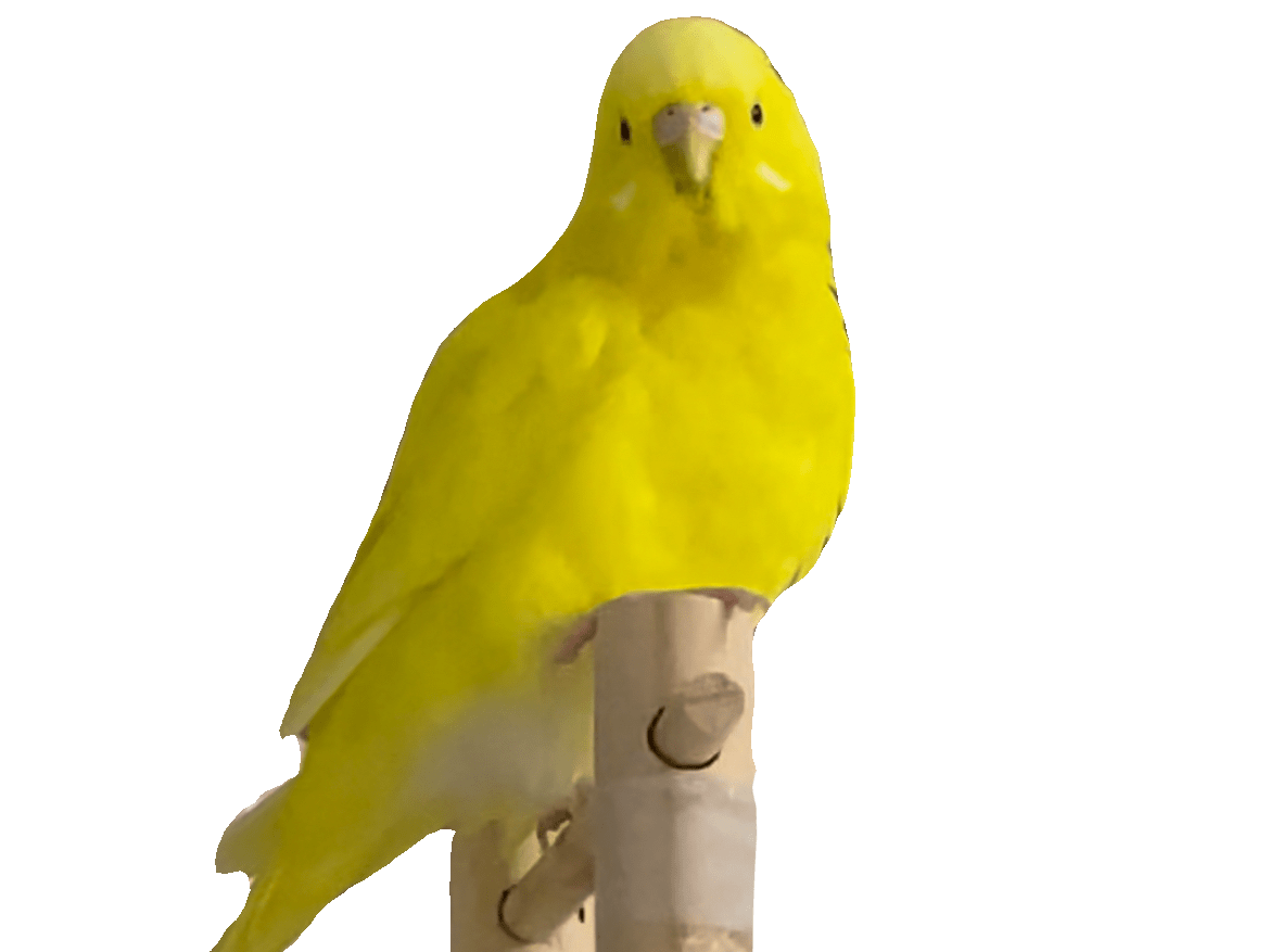 色は黄色で高めの声です。目は真っ黒です。ほっぺは白いです。毛並みが良いです。元々保護したインコなので警戒心が強いです。お腹の縦のラインがはっきりしています。尻尾は長めです。眠くなると大きさが1.5倍程になります。食べることが大好きです。