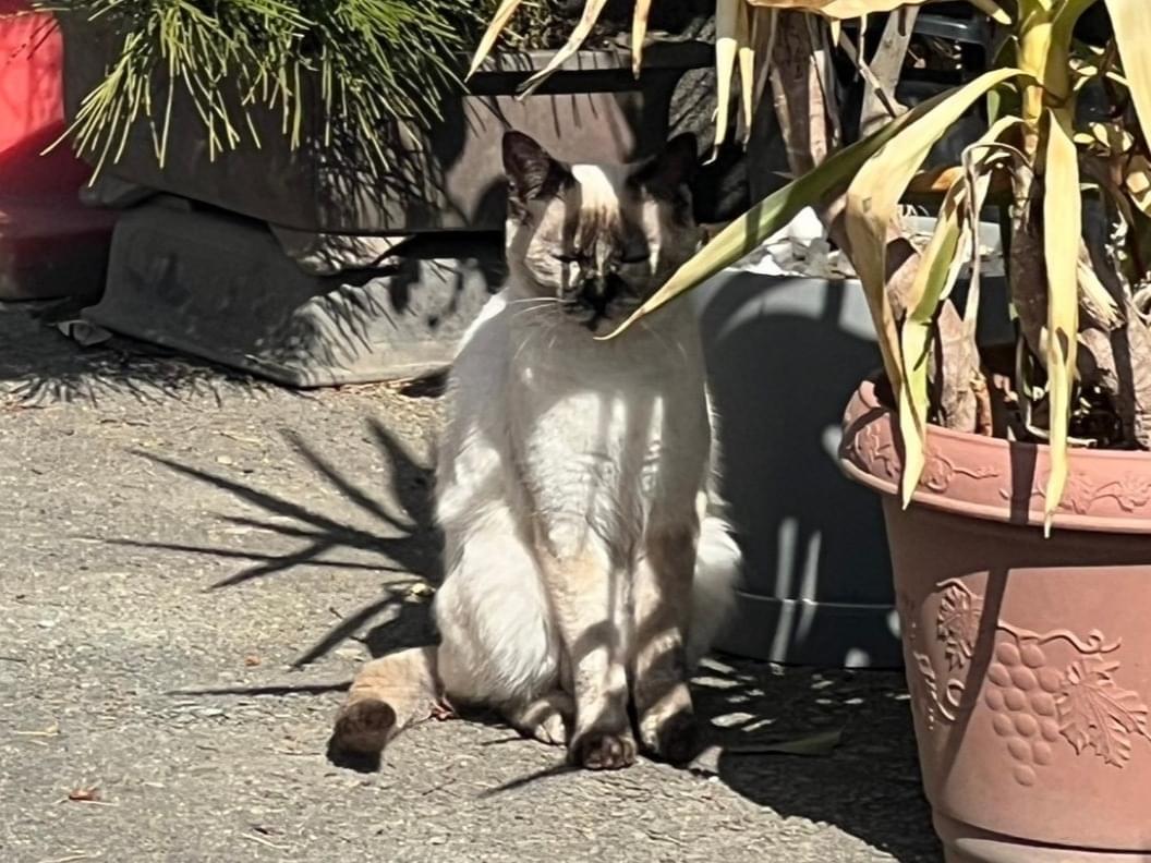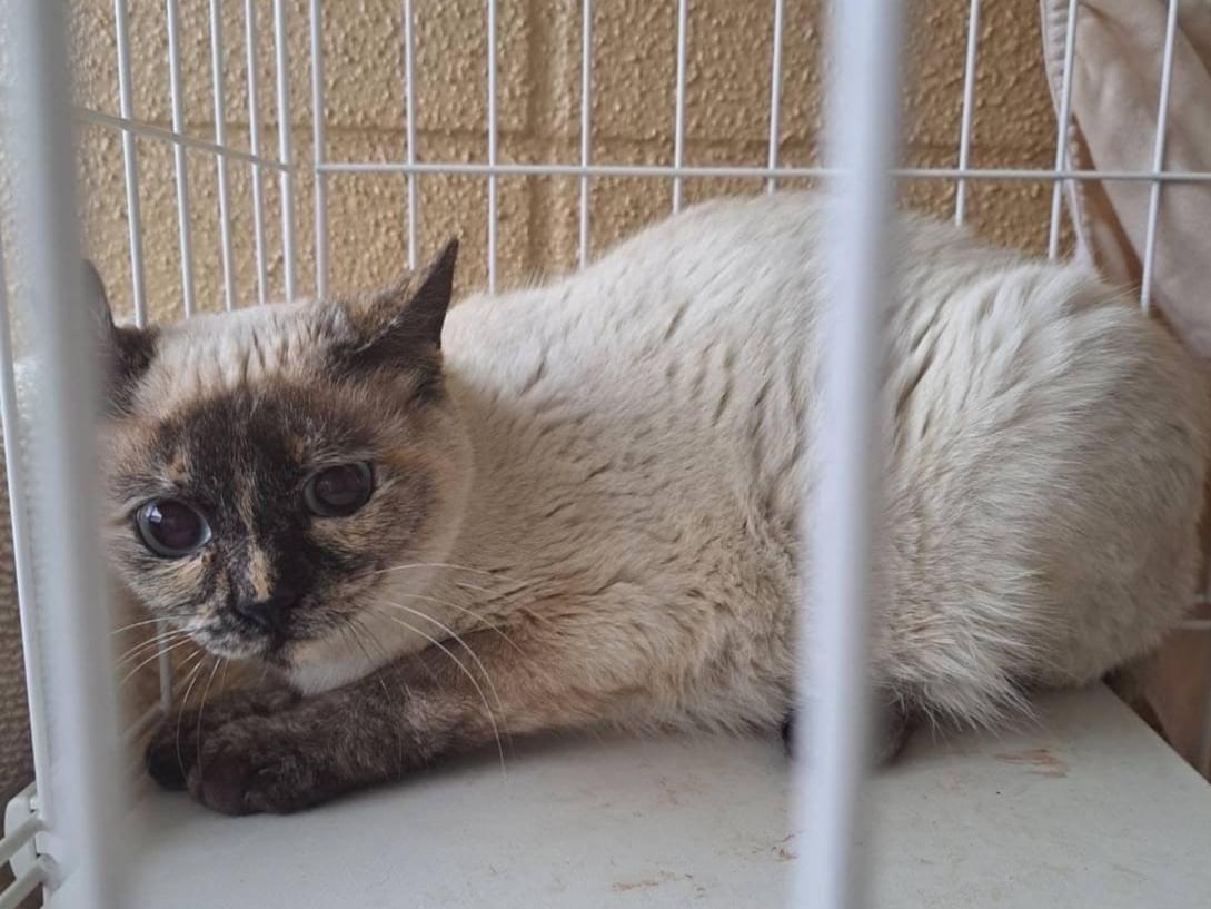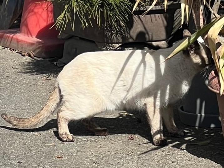 シャムMIX。青い目。鼻の白い筋模様が特徴。 メスですが右耳にカットを入れられてしまいました。