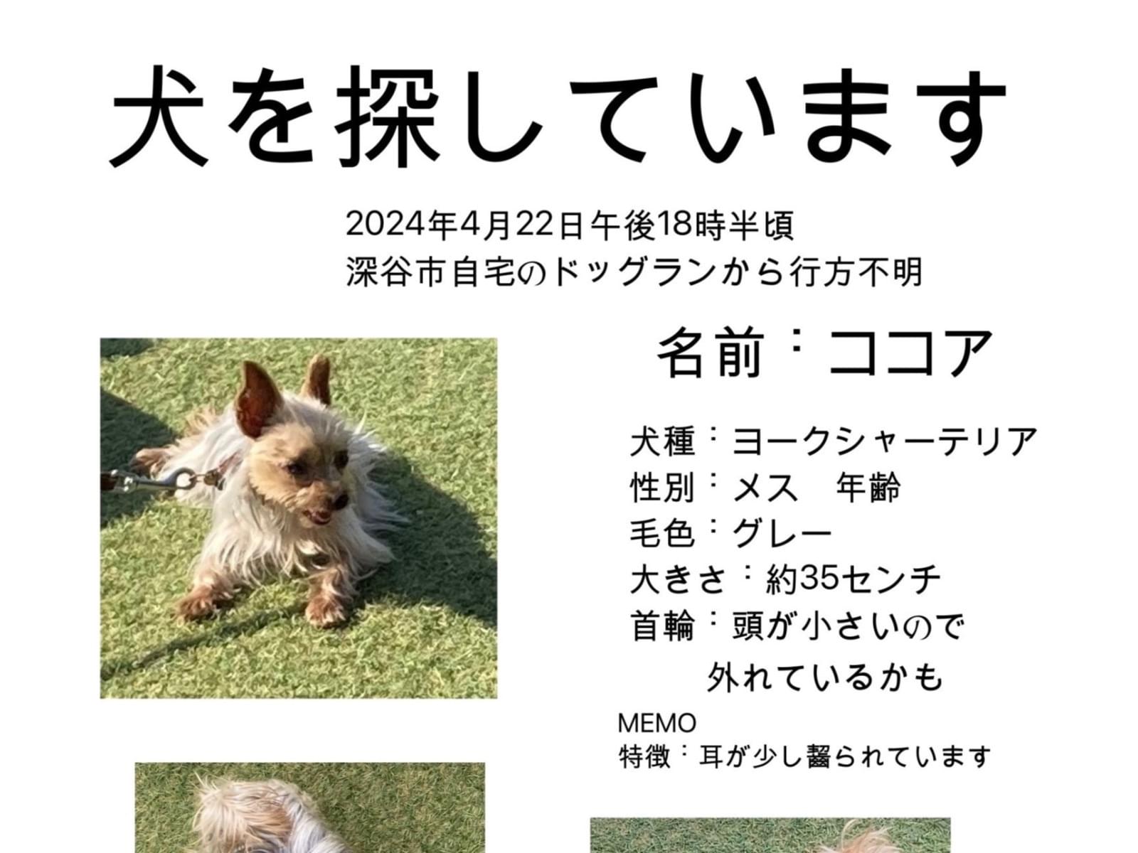 ホーム迷子犬埼玉県片耳が少しかけてます片耳が少しかけてます管理編集するポスター掲載終了最終更新日時:2024/05/23 20:08写真情報用件迷子名前ココア性別メス年齢7歳場所埼玉県 深谷市人見発生日時2024年4月22日(月)飼い主野口説明ドッグランに出してる間にいなくなってしまいました。連絡先URLsuparutacus3@gmail.com掲示板情報交換のための掲示板です。ユーザーからの情報提供、オーナーからの連絡などにご利用下さいませ。書き込んだ情報は、オーナーのメールに通知されます。まだコメントはありません。トピックを作成する