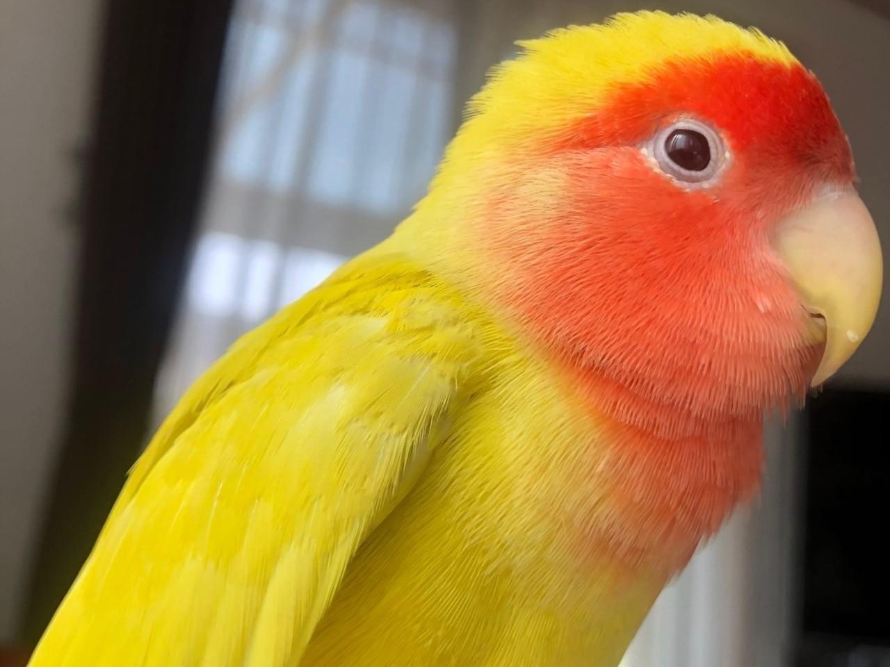 ・色 : 体は黄色。顔は赤。尾羽の辺りは水色。