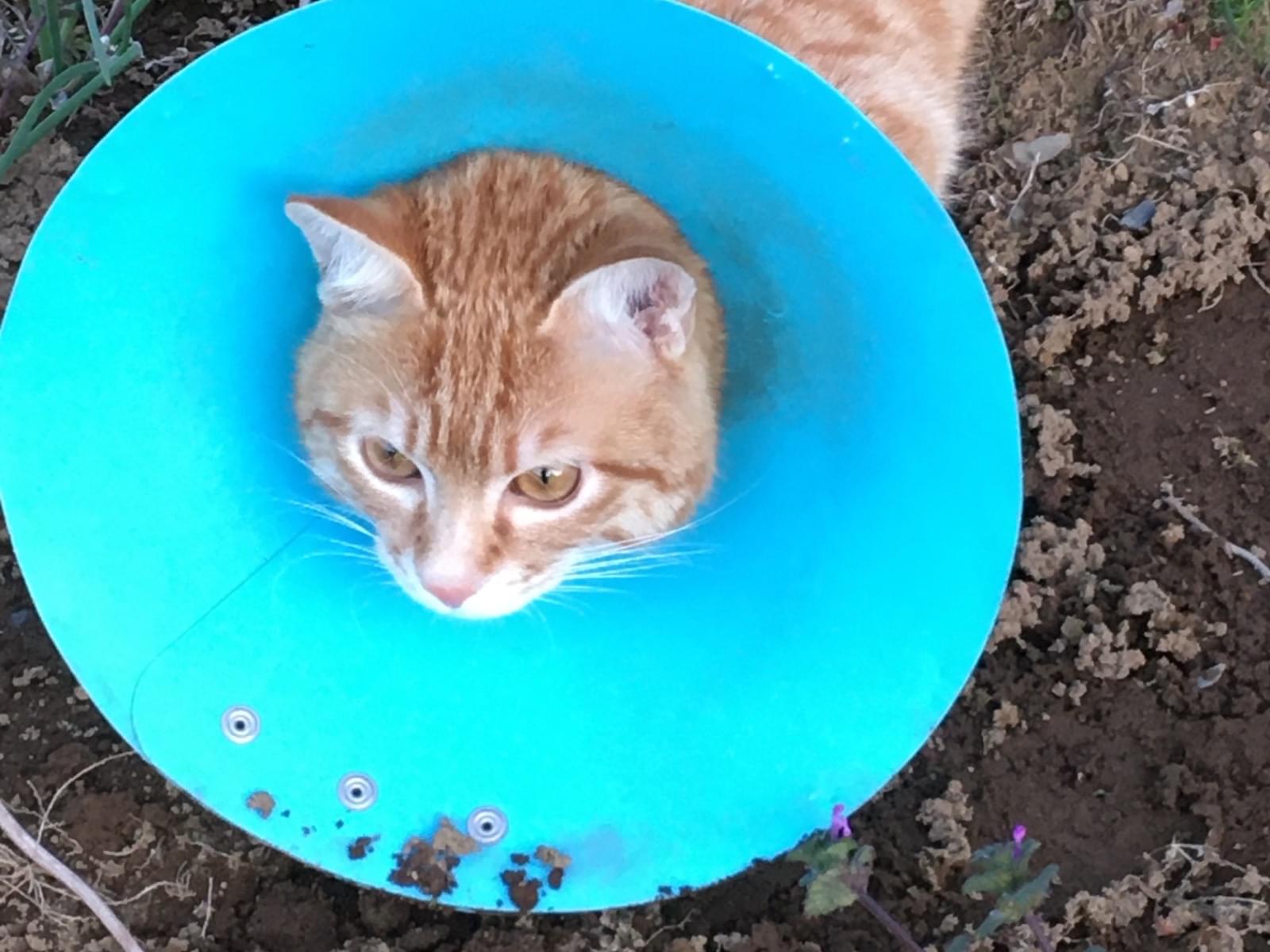 青いエリザベスカラーをした茶トラの猫を3/20頃から毎日見かけます。尻尾の先を怪我しておりかなり化膿しているように見えます。