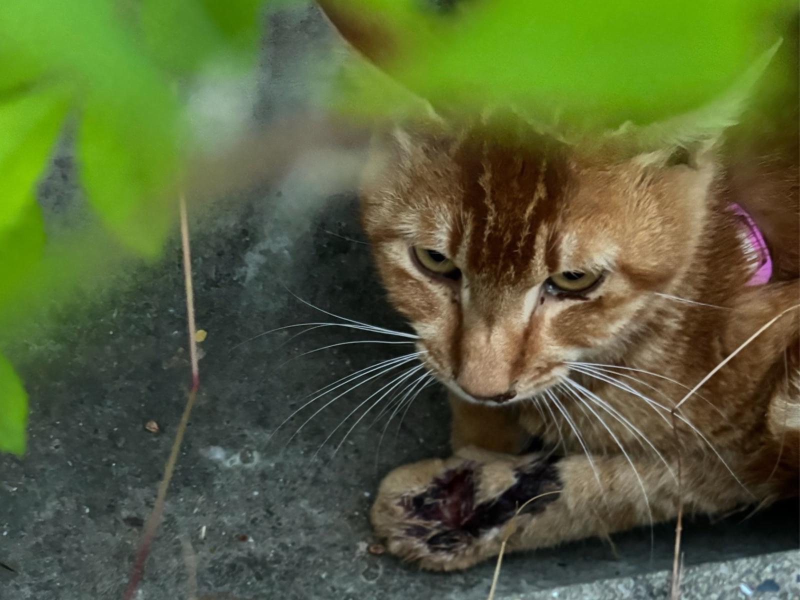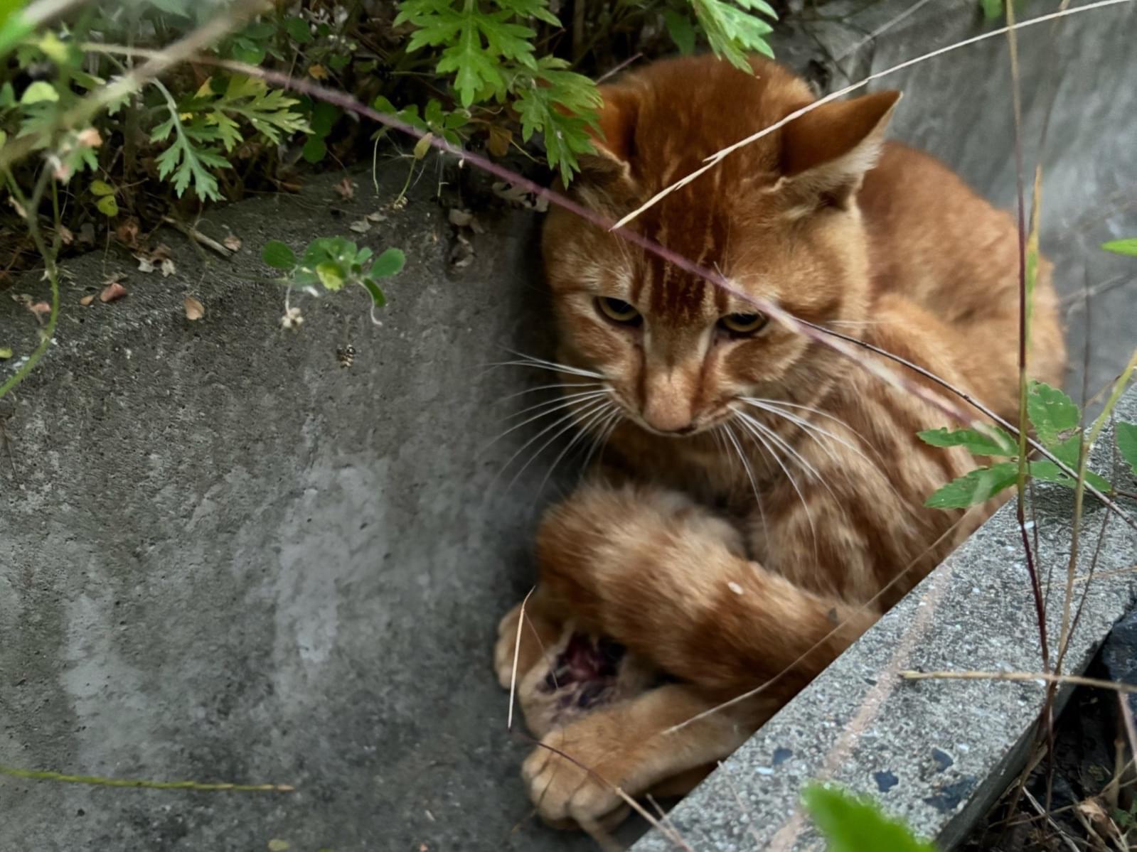 怪我はすでに血が止まり乾燥しているものの肉が見えており、痛いのかしきりに舐めていました。