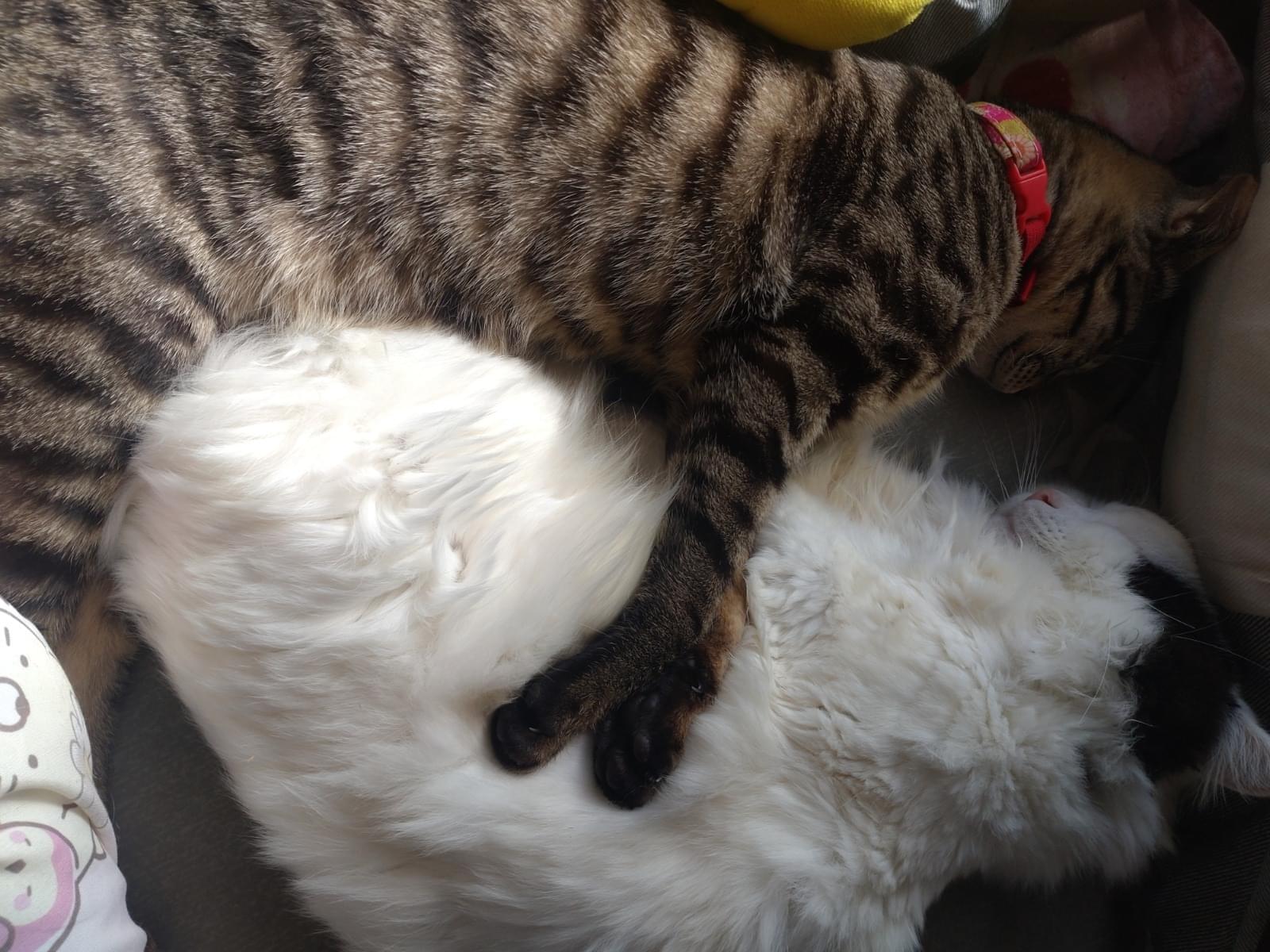 キジトラ柄の雑種の女の子、赤い首輪しています