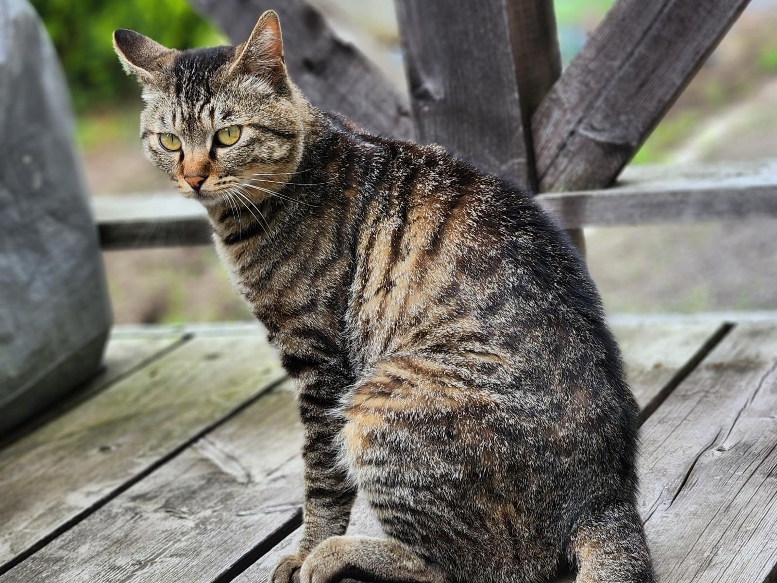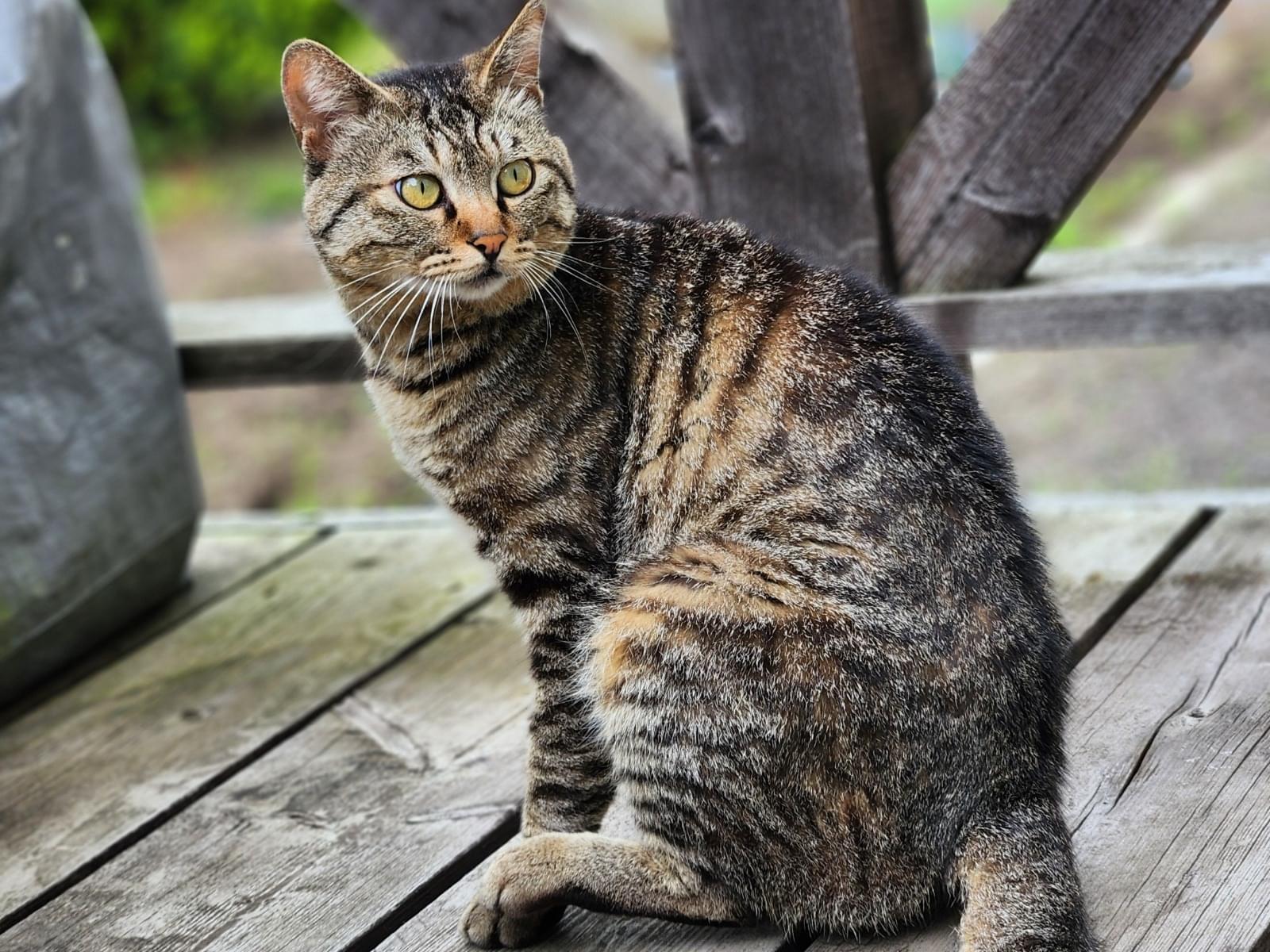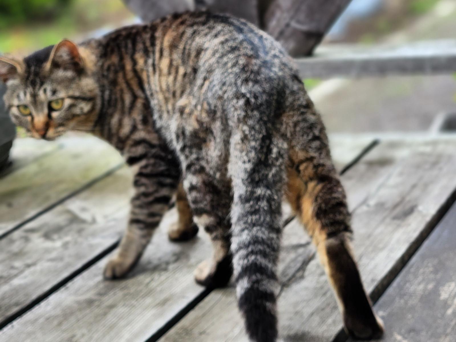 キジトラのオス?っぽい。網戸近くまできて鳴いていました。近寄ると少し離れますがカリカリをあげると周りを警戒しながら食べてました。少し人に免疫ありそう。うちの猫の威嚇には返事してました。