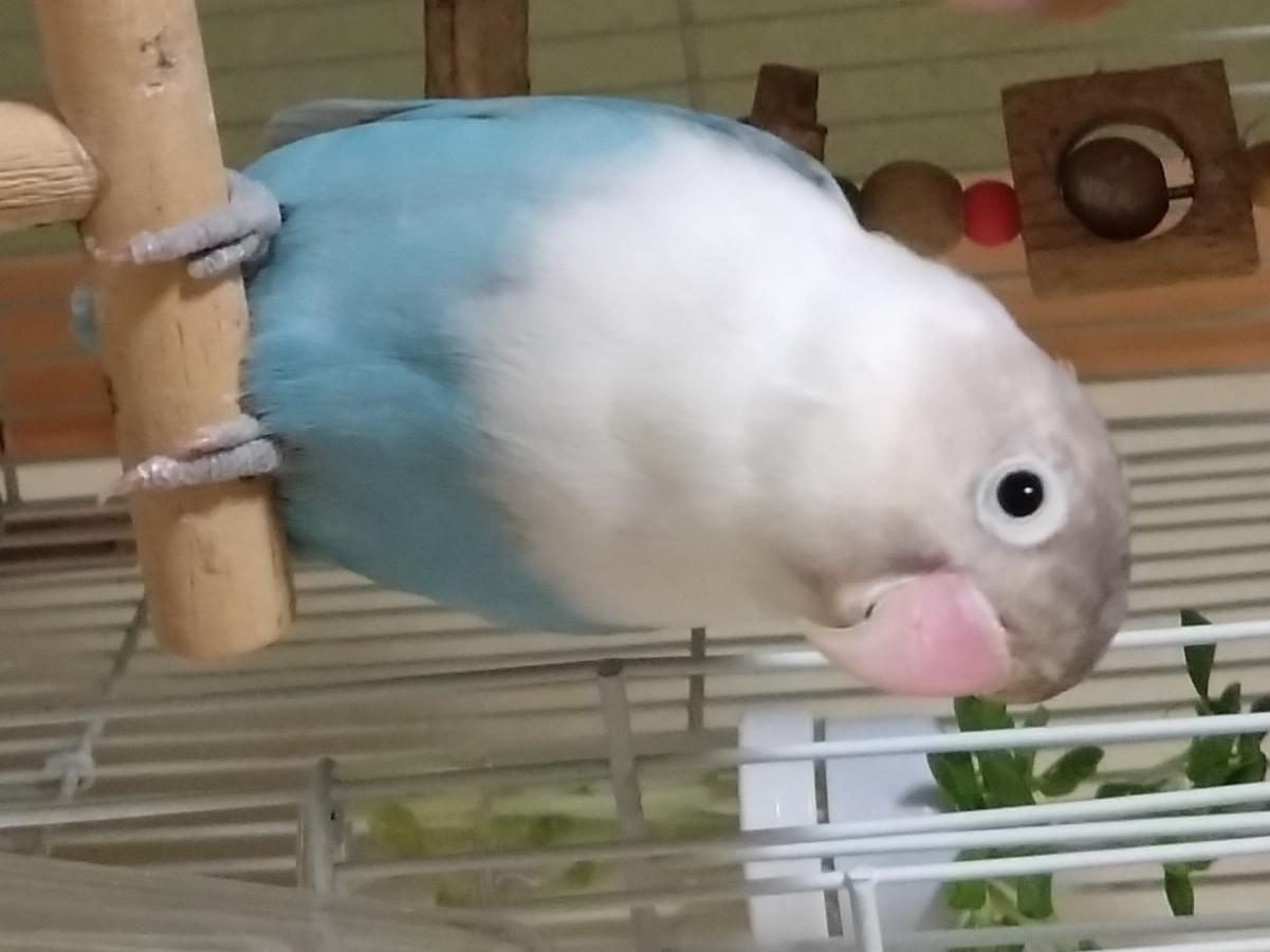 顔は白、目は小さめで、体はグレー寄りの青色でとてもよく鳴く子です。
