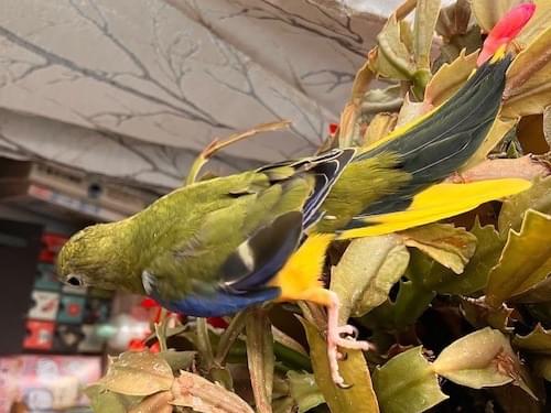 色: 全体オリーブグリーン、お腹は黄色⇒オレンジ 羽先 青⇒黒、 尾羽 外側は緑、内側は黄色