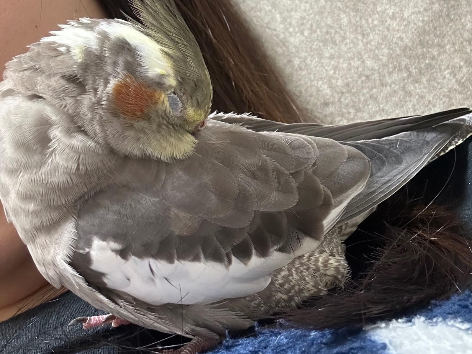 頭の後ろから首にかけては薄黄色(ほぼ白)とグレーのマダラ模様です。