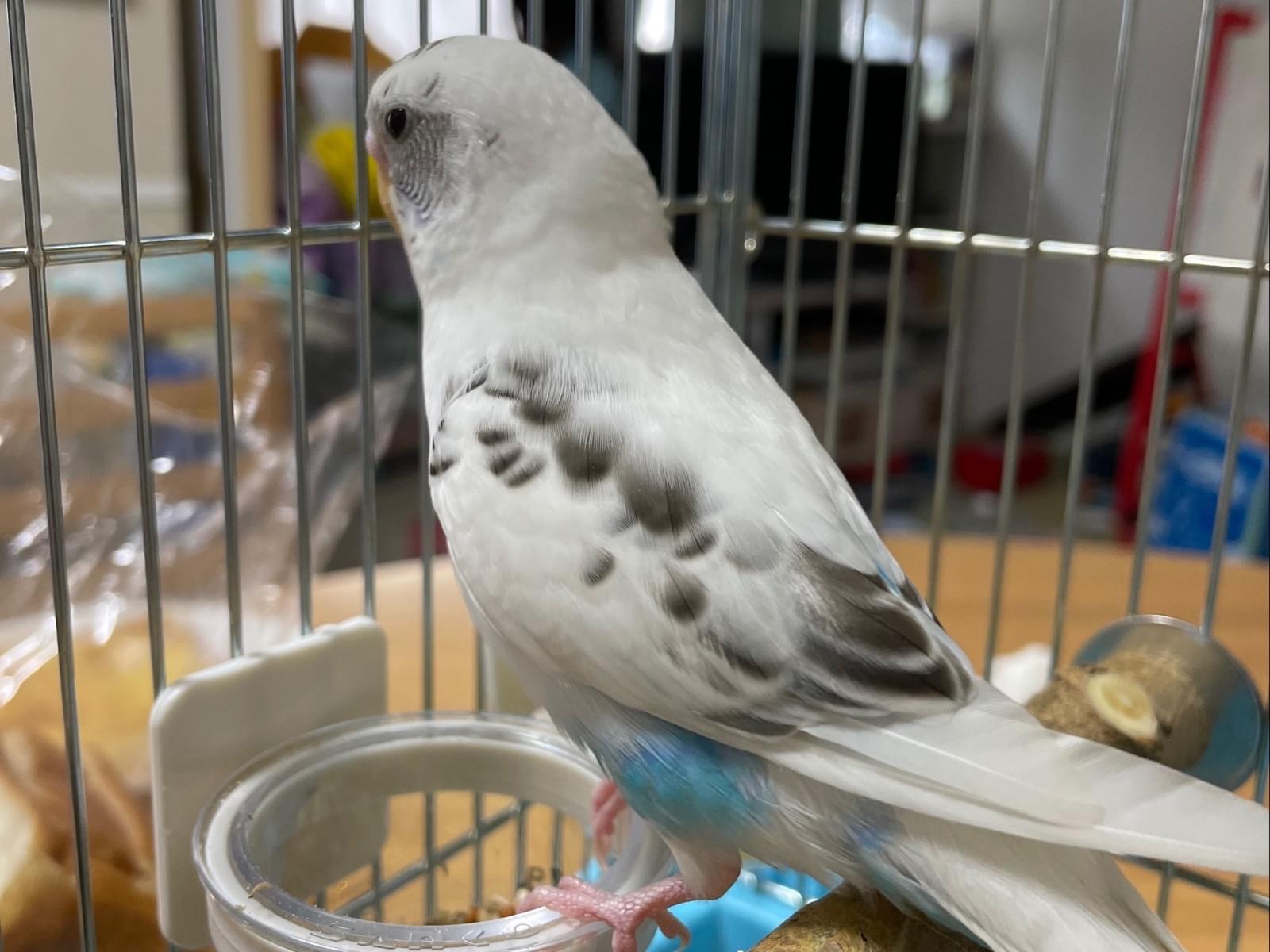 白で、お腹と背中が薄いブルーです。顔と羽に黒い模様があります。