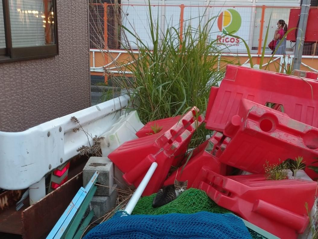 工事の資材置場なので、子猫自身では餌の入手は難しそう。健康状態はあまりよくなさそうに見える。