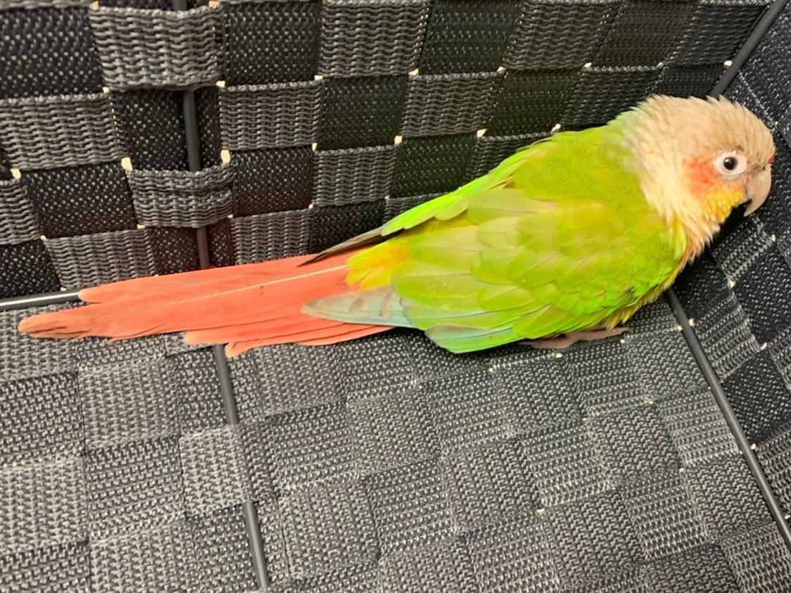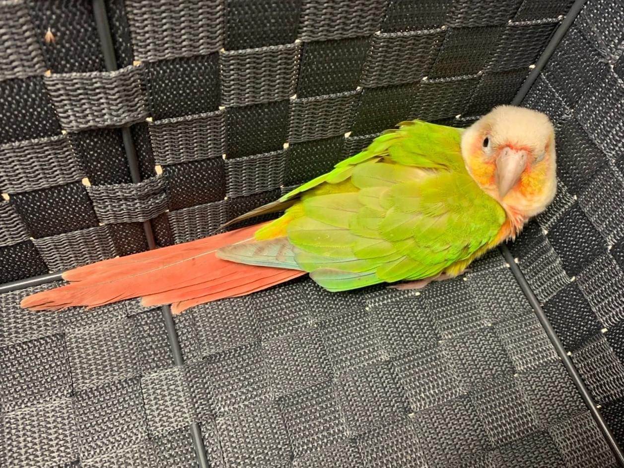 今朝(6月21日)に当社(博多区竹丘町2丁目1-20)で、ウロコインコパイナップルを保護しております。