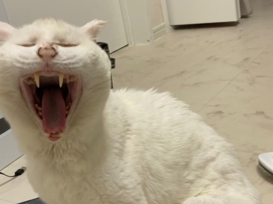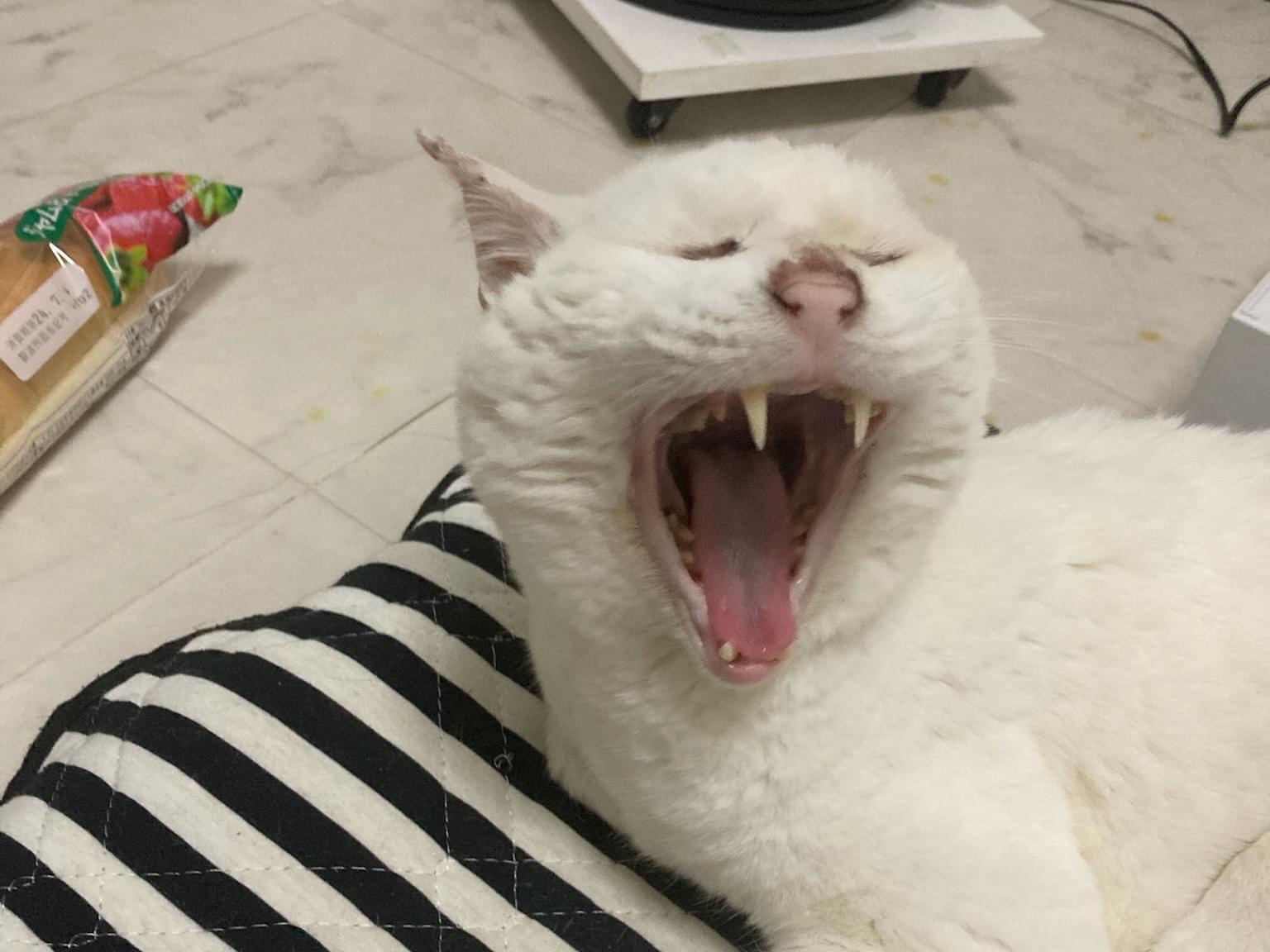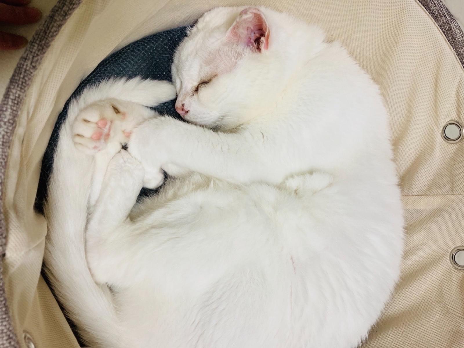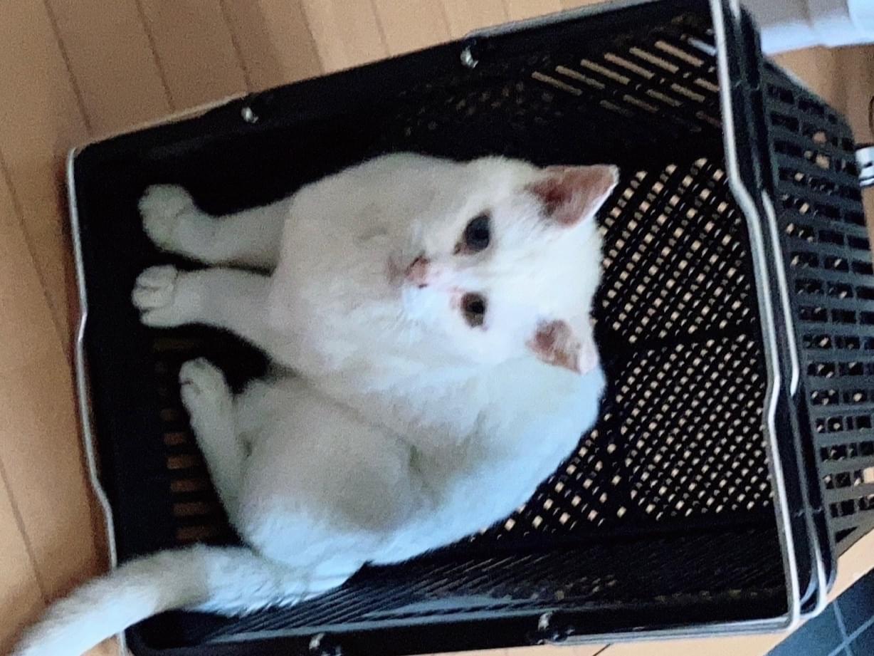 真っ白。声が大きい。首輪なし。オッドアイ(右が青,左が黄色)。