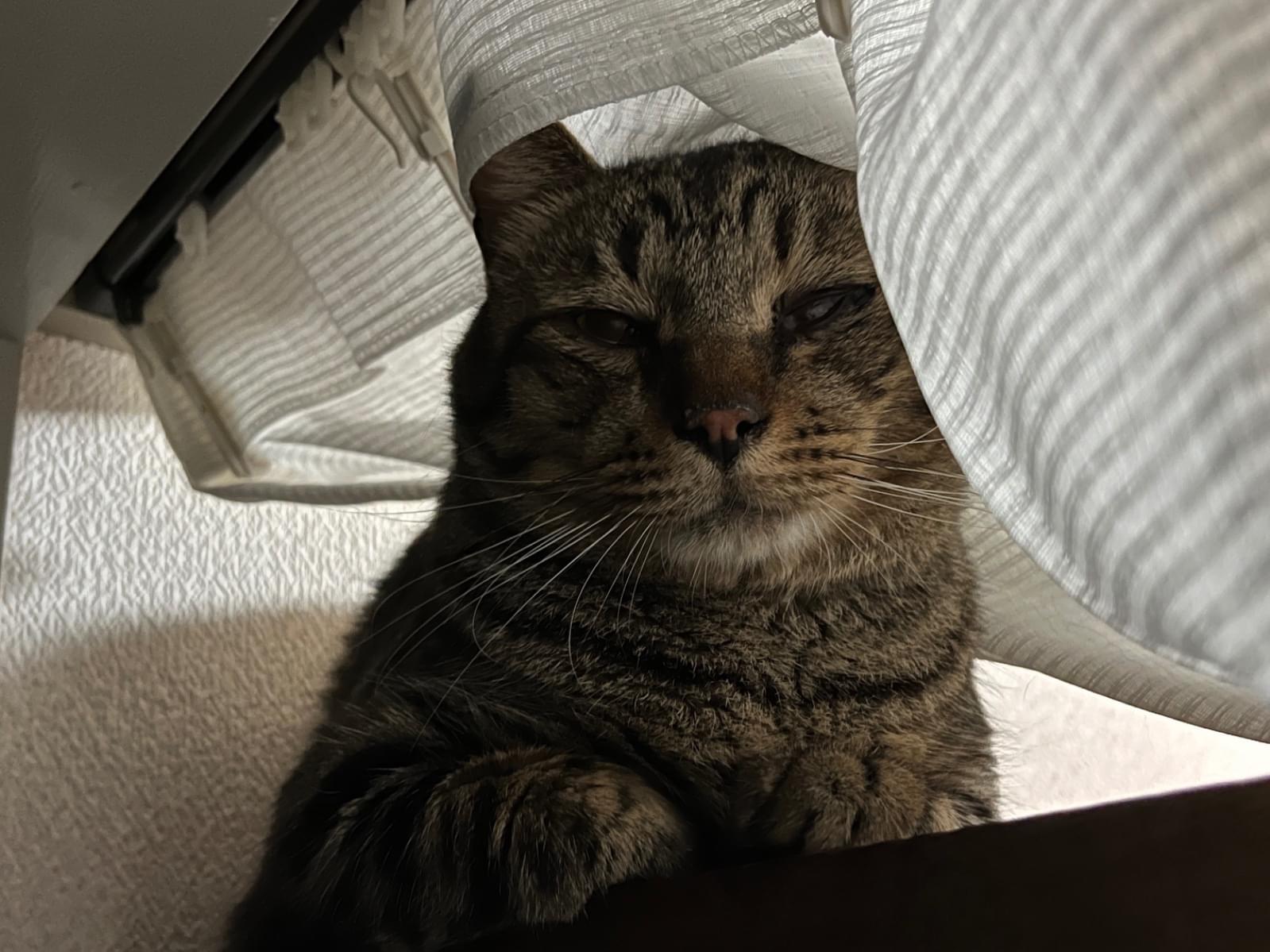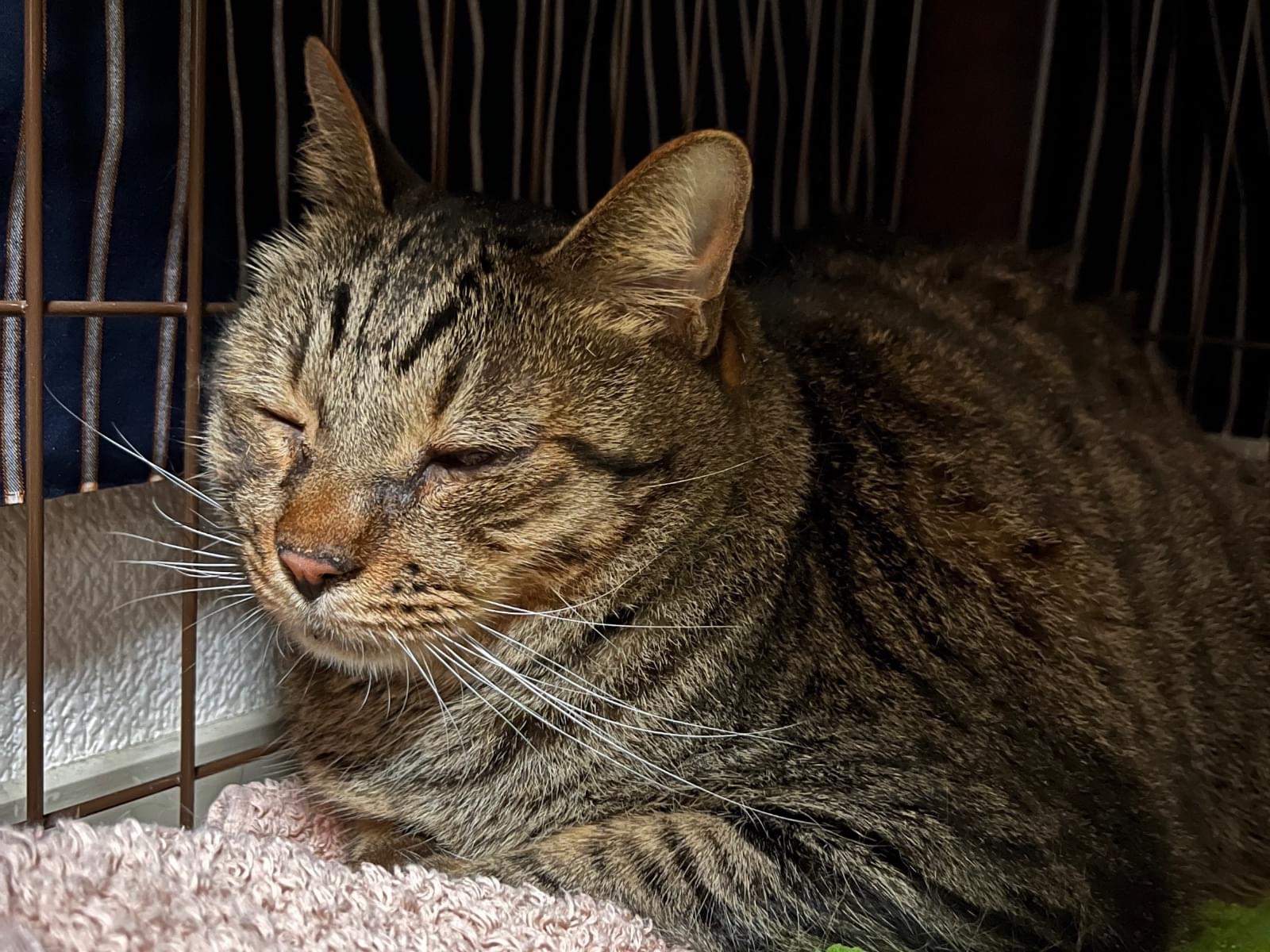 濃いめのキジトラ柄で6kgある大き目の体格です。