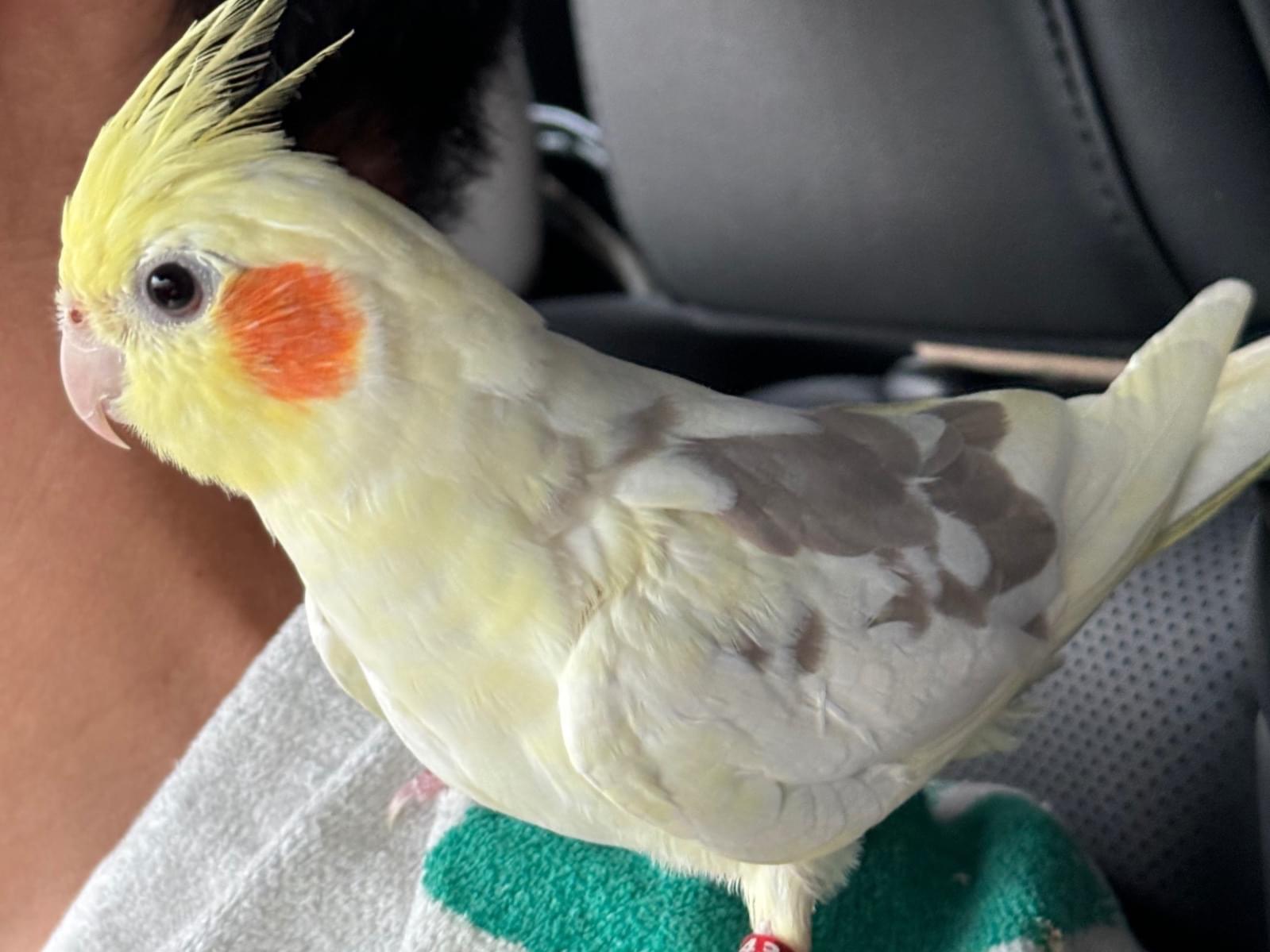 オカメインコ、身体は黄色で背中にグレー色。お目めはまん丸です。