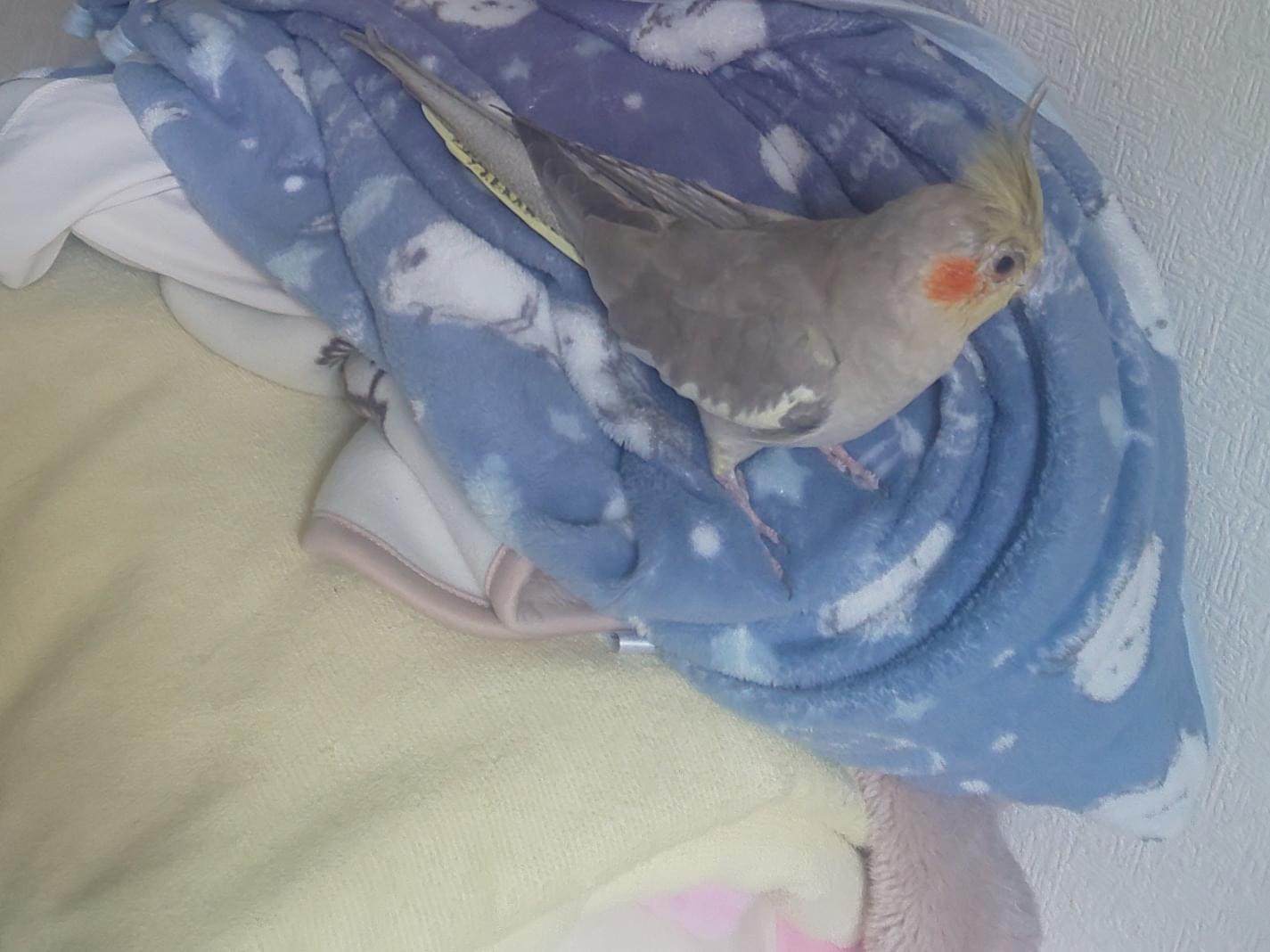 身体はグレー(シナモン)、頭と尾羽には黄色が混ざっています。